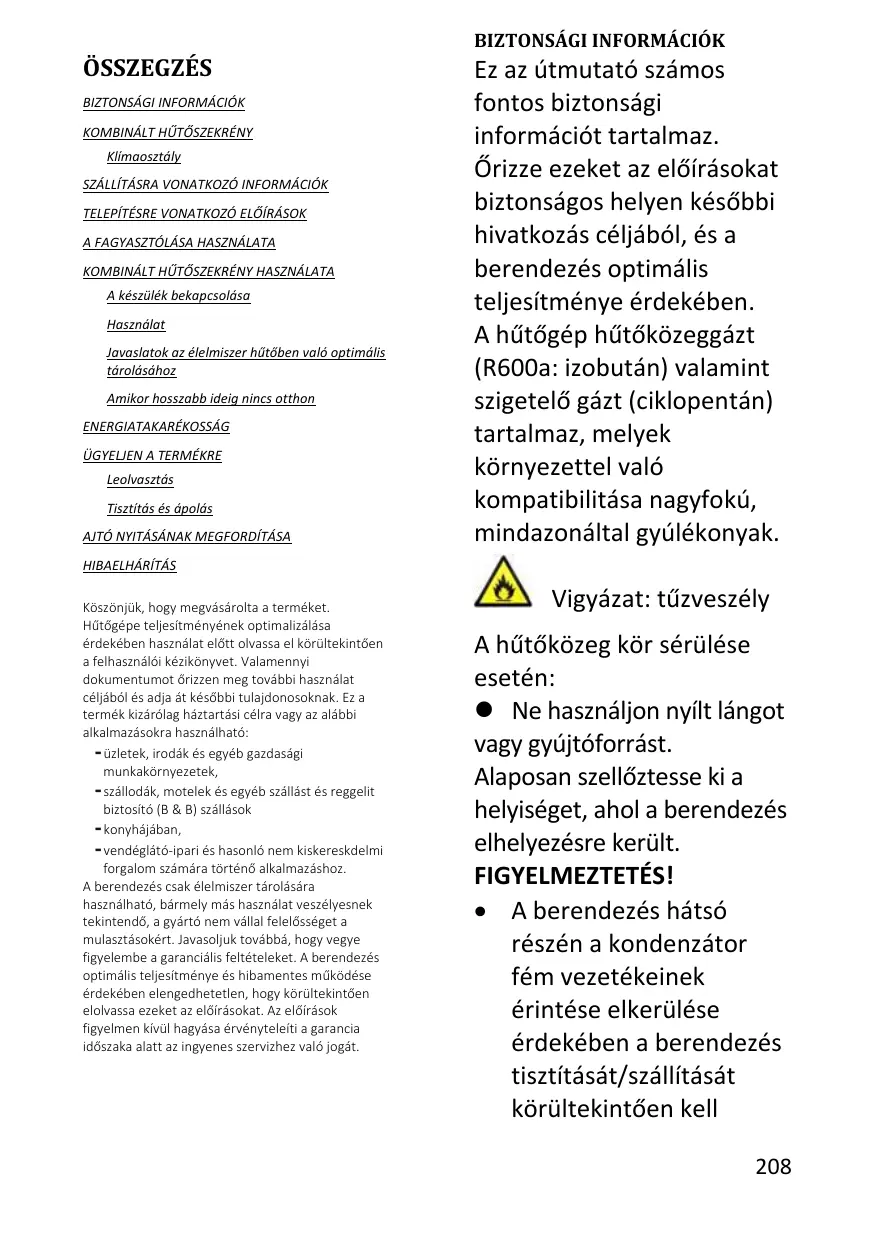 Éviter impérativement l’utilisation de flamme nue ou d’un équipement électrique, comme des radiateurs, des nettoyeurs à vapeur, des bougies, des lampes à pétrole ou similaires pour accélérer la phase de dégivrage. Ne jamais utiliser de l’eau pour laver le compresseur, l’essuyer avec un chiffon sec après le nettoyage pour éviter la rouille. Il est recommandé de garder la fiche dans un état propre, tout résidu de poussière présente en excès sur la fiche peut être la cause d’un incendie. Le produit est conçu et fabriqué pour un usage domestique uniquement. 30