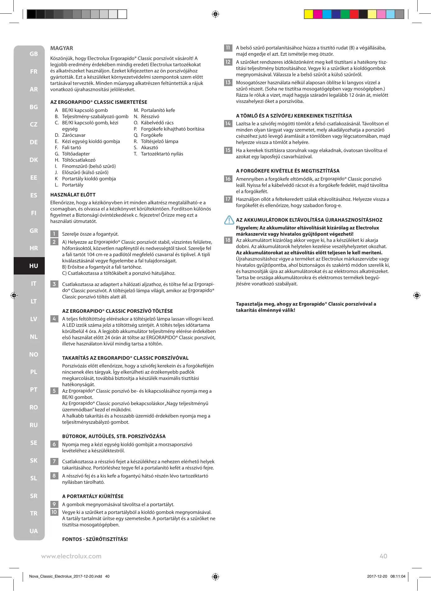 GB FR AR BG CZ DE DK EE ES FI GR HR MAGYAR Köszönjük, hogy Electrolux Ergorapido® Classic porszívót vásárolt! A legjobb eredmény érdekében mindig eredeti Electrolux tartozékokat és alkatrészeket használjon. Ezeket kifejezetten az ön porszívójához gyártották. Ezt a készüléket környezetvédelmi szempontok szem előtt tartásával tervezték. Minden műanyag alkatrészen feltüntettük a rájuk vonatkozó újrahasznosítási jelöléseket.