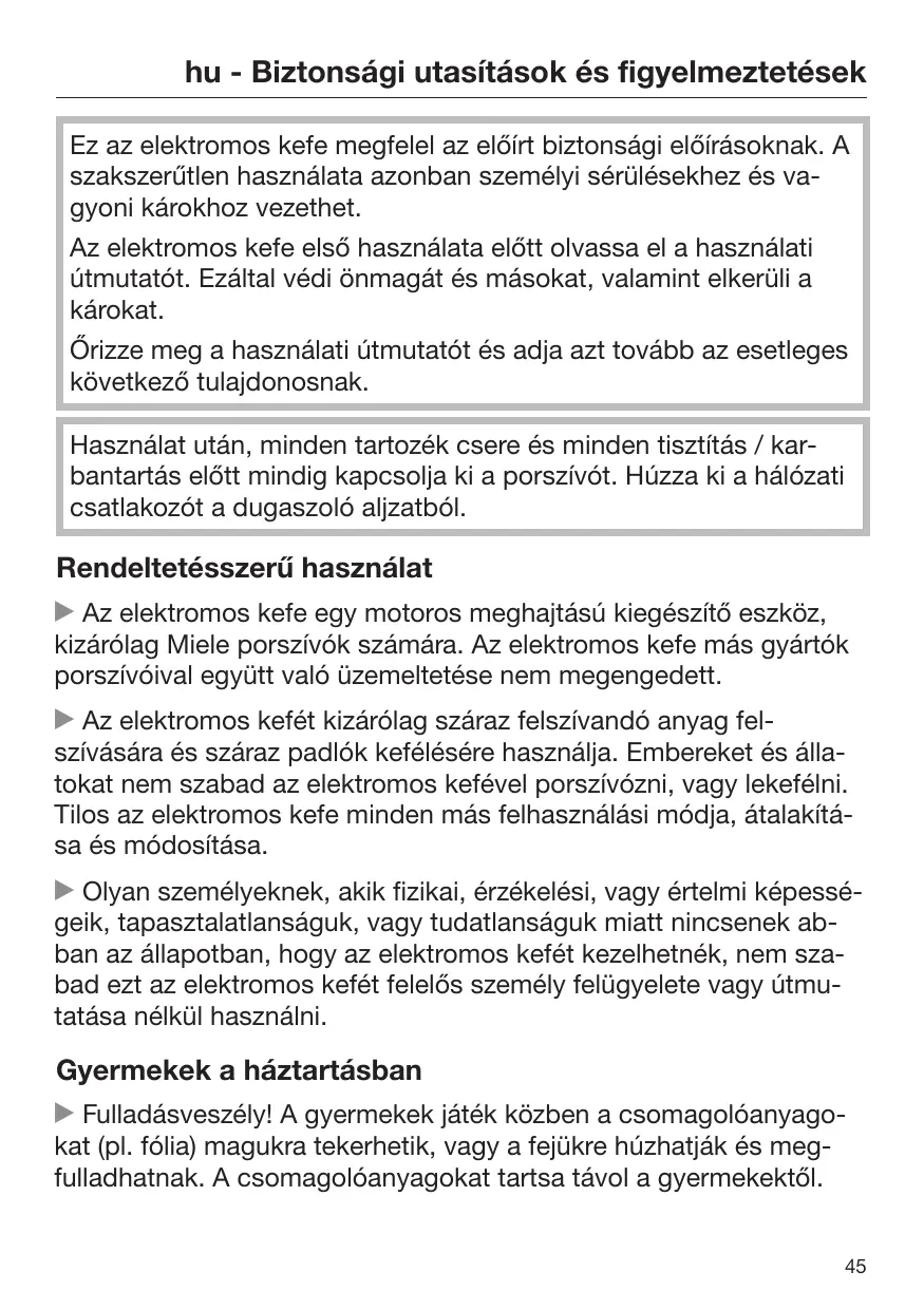 Ez az elektromos kefe megfelel az előírt biztonsági előírásoknak. A szakszerűtlen használata azonban személyi sérülésekhez és vagyoni károkhoz vezethet. De elektrische borstel moet afkoelen. Dat kan als volgt: Sluit de stofzuiger weer aan en schakel het apparaat in. Na circa tien minuten is de borstel weer klaar voor gebruik.