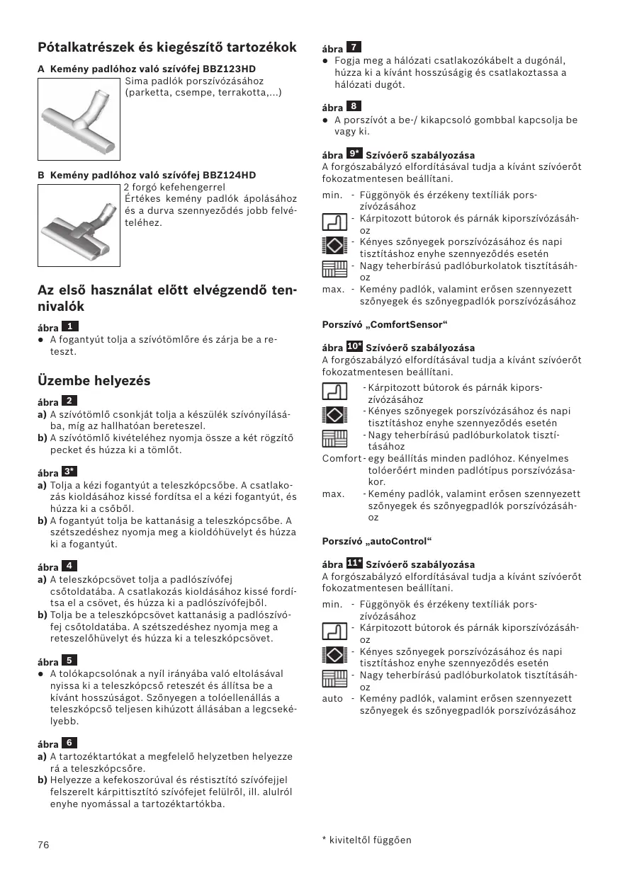 ábra 9* Szívóerő szabályozása A forgószabályzó elfordításával tudja a kívánt szívóerőt fokozatmentesen beállítani. min. - Függönyök és érzékeny textíliák porszívózásához - Kárpitozott bútorok és párnák kiporszívózásához - Kényes szőnyegek porszívózásához és napi tisztításhoz enyhe szennyeződés esetén - Nagy teherbírású padlóburkolatok tisztításához max. - Kemény padlók, valamint erősen szennyezett szőnyegek és szőnyegpadlók porszívózásához Porszívó „ComfortSensor“ ábra 10* Szívóerő szabályozása A forgószabályzó elfordításával tudja a kívánt szívóerőt fokozatmentesen beállítani. - Kárpitozott bútorok és párnák kiporszívózásához - Kényes szőnyegek porszívózásához és napi tisztításhoz enyhe szennyeződés esetén - Nagy teherbírású padlóburkolatok tisztításához Comfort - egy beállítás minden padlóhoz. Kényelmes tolóerőért minden padlótípus porszívózásakor. max. - Kemény padlók, valamint erősen szennyezett szőnyegek és szőnyegpadlók porszívózásához Porszívó „autoControl“ ábra 11* Szívóerő szabályozása A forgószabályzó elfordításával tudja a kívánt szívóerőt fokozatmentesen beállítani. min. - Függönyök és érzékeny textíliák porszívózásához - Kárpitozott bútorok és párnák kiporszívózásához - Kényes szőnyegek porszívózásához és napi tisztításhoz enyhe szennyeződés esetén - Nagy teherbírású padlóburkolatok tisztításához auto - Kemény padlók, valamint erősen szennyezett szőnyegek és szőnyegpadlók porszívózásához