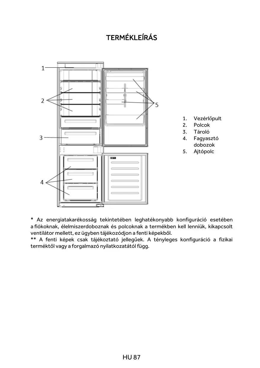 * Az energiatakarékossäg tekintetében leghatékonyabb konfiguräcié esetében afiékoknak, élelmiszerdoboznak és polcoknak a termékben kell lenniük, kikapcsolt ventilétor mellett, ez ügyben téjékozédjon a fenti képekbôl.