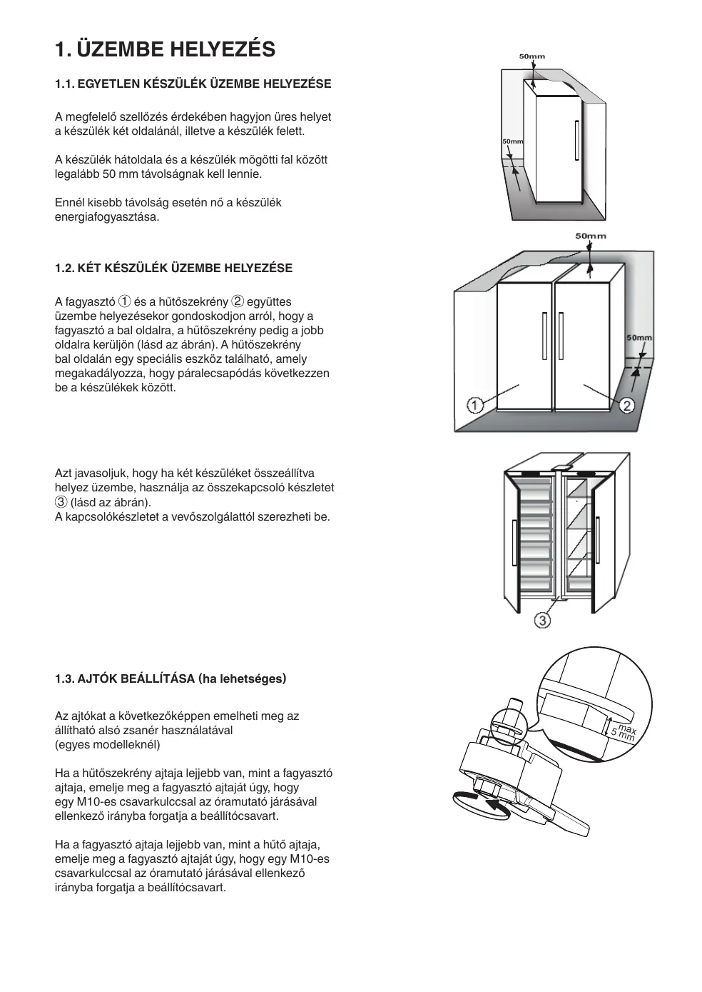 1.2. INSTALLATION DE DEUX APPAREILS Durant l'installation du congélateur 1 et du réfrigérateur 2 , assurez-vous que le congélateur est placé à gauche et le réfrigérateur à droite (comme illustré sur l'image). Sur le côté gauche du réfrigérateur se trouve un dispositif spécial permettant d'éviter les problèmes de condensation entre les appareils.