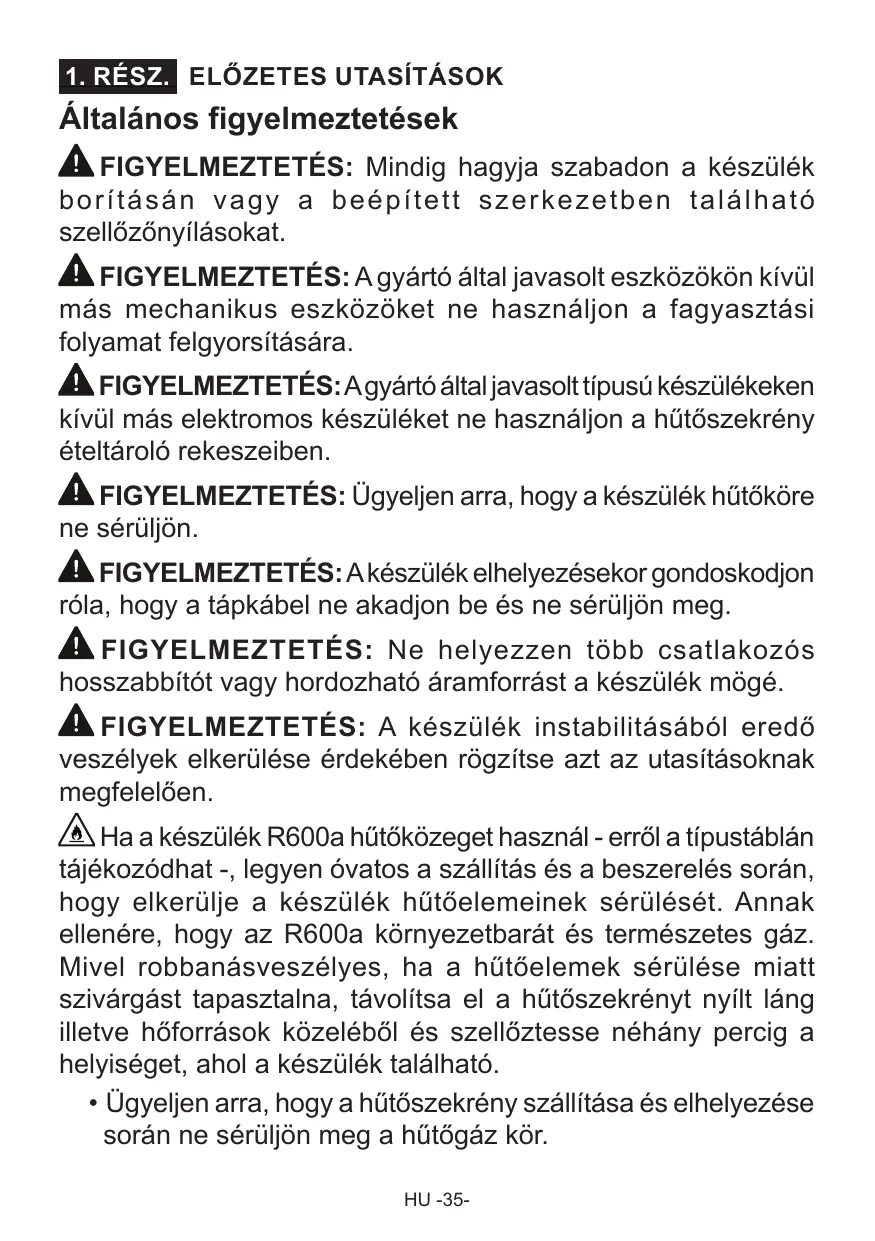 Âltalänos figyelmeztetések À FIGYELMEZTETÉS: Mindig hagyja szabadon a készülék boritäsän vagy a beépitett szerkezetben talélhaté szell6zényiläsokat. À FIGYELMEZTETÉS: À gyärté éltal javasolt eszkôzôkôn kivül mäs mechanikus eszkôzôket ne hasznäljon a fagyasztäsi folyamat felgyorsitäsära. À FIGYELMEZTETÉS:Agyärté éltal javasolt tipusü készülékeken kivül mâs elektromos készüléket ne hasznäljon a hütészekrény ételtärolé rekeszeiben. À FIGYELMEZTETÉS: Ügyeljen arra, hogy a készülék hütôkôre ne sérüljôn. À FIGYELMEZTETÉS: Akészülék elhelyezésekor gondoskodjon rôla, hogy a tâpkébel ne akadjon be és ne sérüljôn meg. À FIGYELMEZTETÉS: Ne helyezzen tôbb csatlakozos hosszabbitôt vagy hordozhaté éramforräst a készülék môgé. À FIGYELMEZTETÉS: A készülék instabilitäsäb6l eredé veszélyek elkerülése érdekében rôgzitse azt az utasitésoknak megfeleléen. A Ha a készülék R600a hütékôzeget hasznäl - errél a tipustäblän tâjékozodhat -, legyen évatos a szällitâs és a beszerelés sorän, hogy elkerülje a készülék hütéelemeinek sérülését. Annak ellenére, hogy az R600a kôrnyezetbaräât és természetes gäz. Mivel robbanäsveszélyes, ha a hütéelemek sérülése miatt szivérgäst tapasztalna, tâvolitsa el a hütészekrényt nyilt läng illetve héforräsok kôzelébôl és szelléztesse néhäny percig a helyiséget, ahol a készülék talélhaté. - Ügyeljen arra, hogy a hütészekrény szällitäsa és elhelyezése sorän ne sérüljôn meg a hütôgäz kür. HU -35-
