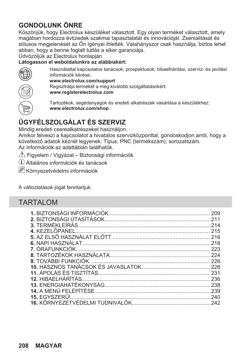 TARTALOM 1. BIZTONSÁGI INFORMÁCIÓK 209 2. BIZTONSÁGI UTASÍTÁSOK211 3. TERMÉKLEÍRÁS214 4. KEZELŐPANEL 215 5. AZ ELSŐ HASZNÁLAT ELŐTT 216 6. NAPI HASZNÁLAT218 7. ÓRAFUNKCIÓK 223 8. TARTOZÉKOK HASZNÁLATA 224 9. TOVÁBBI FUNKCIÓK 226 10. HASZNOS TANÁCSOK ÉS JAVASLATOK 228 11. ÁPOLÁS ÉS TISZTÍTÁS 231 12. HIBAELHÁRÍTÁS 236 13. ENERGIAHATÉKONYSÁG238 14. A MENÜ FELÉPÍTÉSE239 15. EGYSZERŰ!240 16. KÖRNYEZETVÉDELMI TUDNIVALÓK242