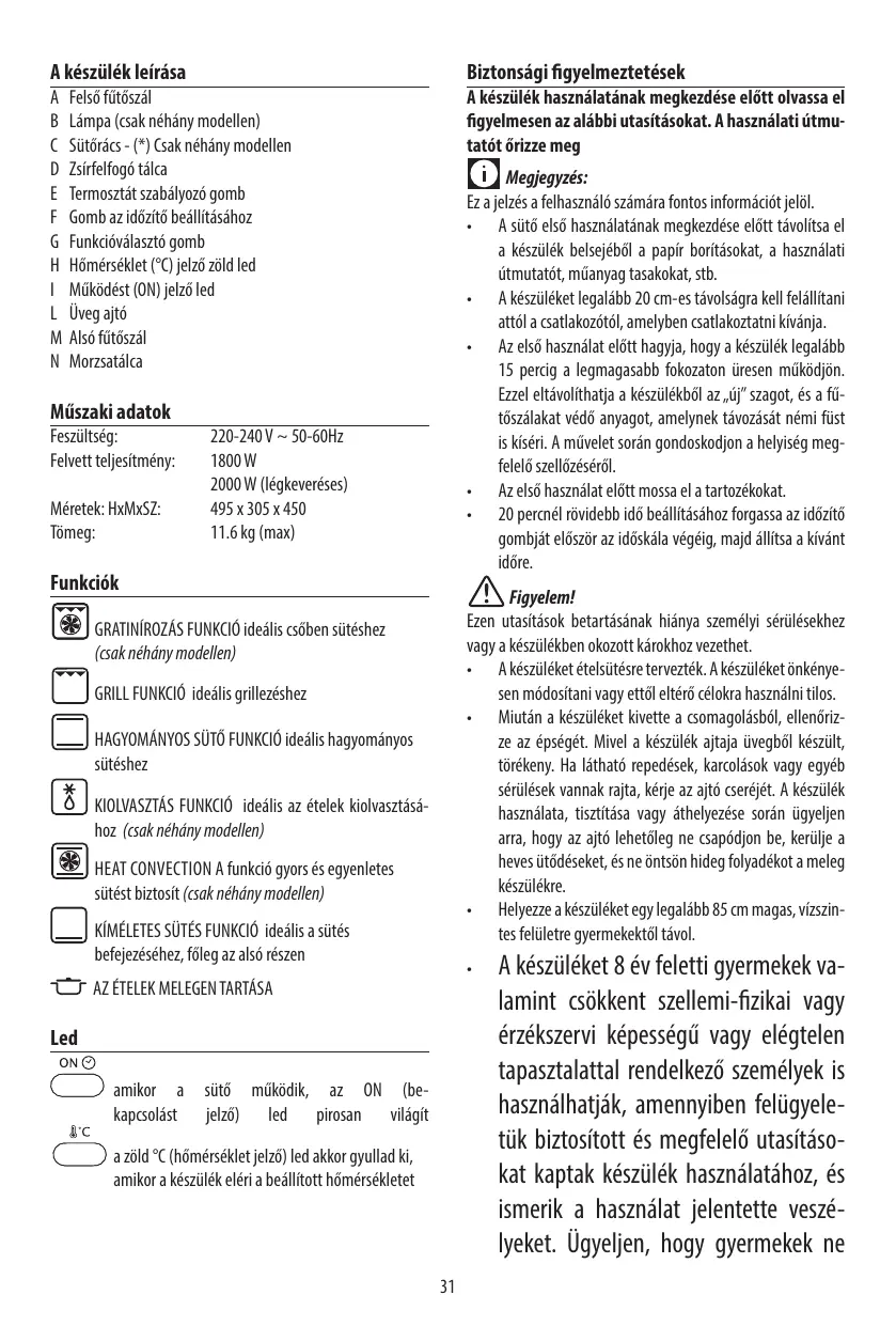 Son cordon d’alimentation est défectueux L’appareil est tombé ou s’il présente des dégâts visibles ou des anomalies de fonctionnement. Le cas échéant, afin d’éviter tout risque, faites-le vérifier par le Centre de Service Après-vente le plus proche. N’installez pas l’appareil à proximité de sources de chaleur. N’utilisez pas l’appareil comme source de chaleur. Ne mettez jamais de papier, carton ou plastique dans le four et ne posez jamais rien dessus (ustensiles, grilles ou autres objets). N’introduisez rien dans les bouches de ventilation. Veillez à ne pas les obstruer. Ce four n’est pas conçu pour être encastré. Une fois la porte ouverte, n’y appuyez jamais des objets lourds, des casseroles ou récipients brûlants. Ne tirez pas la poignée vers le bas.