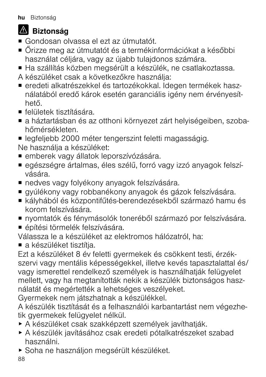¡ avec des pièces et accessoires d’origine. En cas de dommages dus à l’utilisation de produits tiers, le droit à la garantie expire. ¡ pour nettoyer les surfaces. ¡ pour un usage domestique privé et dans les pièces fermées d’un domicile, à la température ambiante. ¡ jusqu'à une altitude maximale de 2000 m au-dessus du niveau de la mer. N’utilisez pas l’appareil : ¡ pour l’aspiration de personnes et d’animaux. ¡ pour l’aspiration de substances nocives pour la santé, aux arêtes vives, chaudes ou brûlantes. ¡ pour l’aspiration de substances humides ou liquides. ¡ pour l’aspiration de substances et gaz légèrement inflammables ou explosibles. ¡ pour l’aspiration de cendres, de la suie de four et d’installations de chauffage central. ¡ pour l’aspiration de poussières de toner des imprimantes et copieurs. ¡ pour l’aspiration de débris de construction. Débranchez l’appareil du secteur lorsque : ¡ vous nettoyez l’appareil. Les enfants de 8 ans et plus, les personnes souffrant d’un handicap physique, sensoriel ou mental ou ne détenant pas l’expérience et/ou les connaissances nécessaires pourront utiliser cet appareil à condition de le faire sous surveillance, ou que son utilisation sûre leur ait été enseignée et qu’ils aient compris les dangers qui en émanent. Les enfants ne sont pas autorisés à jouer avec l'appareil. 20