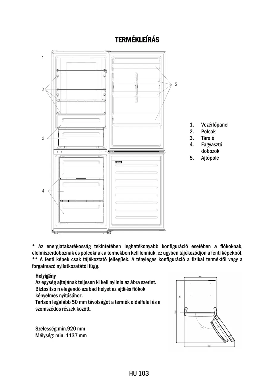 * Az energiatakarékosság tekintetében leghatékonyabb konfiguráció esetében a fiókoknak, élelmiszerdoboznak és polcoknak a termékben kell lenniük, ez ügyben tájékozódjon a fenti képekből. ** A fenti képek csak tájékoztató jellegűek. A tényleges konfiguráció a fizikai terméktől vagy a forgalmazó nyilatkozatától függ. Helyigény Az egység ajtajának teljesen ki kell nyílnia az ábra szerint. Biztosítso n elegendő szabad helyet az ajtók és fiókok kényelmes nyitásához. Tartson legalább 50 mm távolságot a termék oldalfalai és a szomszédos részek között. Szélesség:min.920 mm Mélység: min. 1137 mm