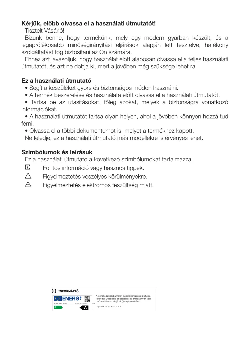 Kérjük, előbb olvassa el a használati útmutatót! Tisztelt Vásárló! Bízunk benne, hogy termékünk, mely egy modern gyárban készült, és a legaprólékosabb minőségirányítási eljárások alapján lett tesztelve, hatékony szolgáltatást fog biztosítani az Ön számára. Ehhez azt javasoljuk, hogy használat előtt alaposan olvassa el a teljes használati útmutatót, és azt ne dobja ki, mert a jövőben még szüksége lehet rá. Ez a használati útmutató • Segít a készüléket gyors és biztonságos módon használni. • A termék beszerelése és használata előtt olvassa el a használati útmutatót. • Tartsa be az utasításokat, főleg azokat, melyek a biztonságra vonatkozó információkat. • A használati útmutatót tartsa olyan helyen, ahol a jövőben könnyen hozzá tud férni. • Olvassa el a többi dokumentumot is, melyet a termékhez kapott. Ne feledje, ez a használati útmutató más modellekre is érvényes lehet. Szimbólumok és leírásuk Ez a használati útmutató a következő szimbólumokat tartalmazza: C Fontos információ vagy hasznos tippek. A Figyelmeztetés veszélyes körülményekre. B Figyelmeztetés elektromos feszültség miatt.