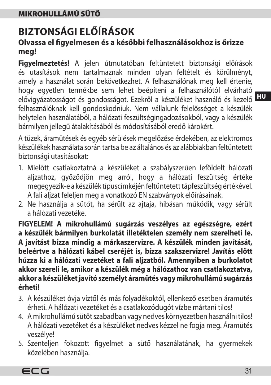 - Mint a legtöbb sūtō esetében, a készülékházban keletkezǒ tuz elkerülèse érdekében a biztonsági utasítások szigó betartására van szükség.