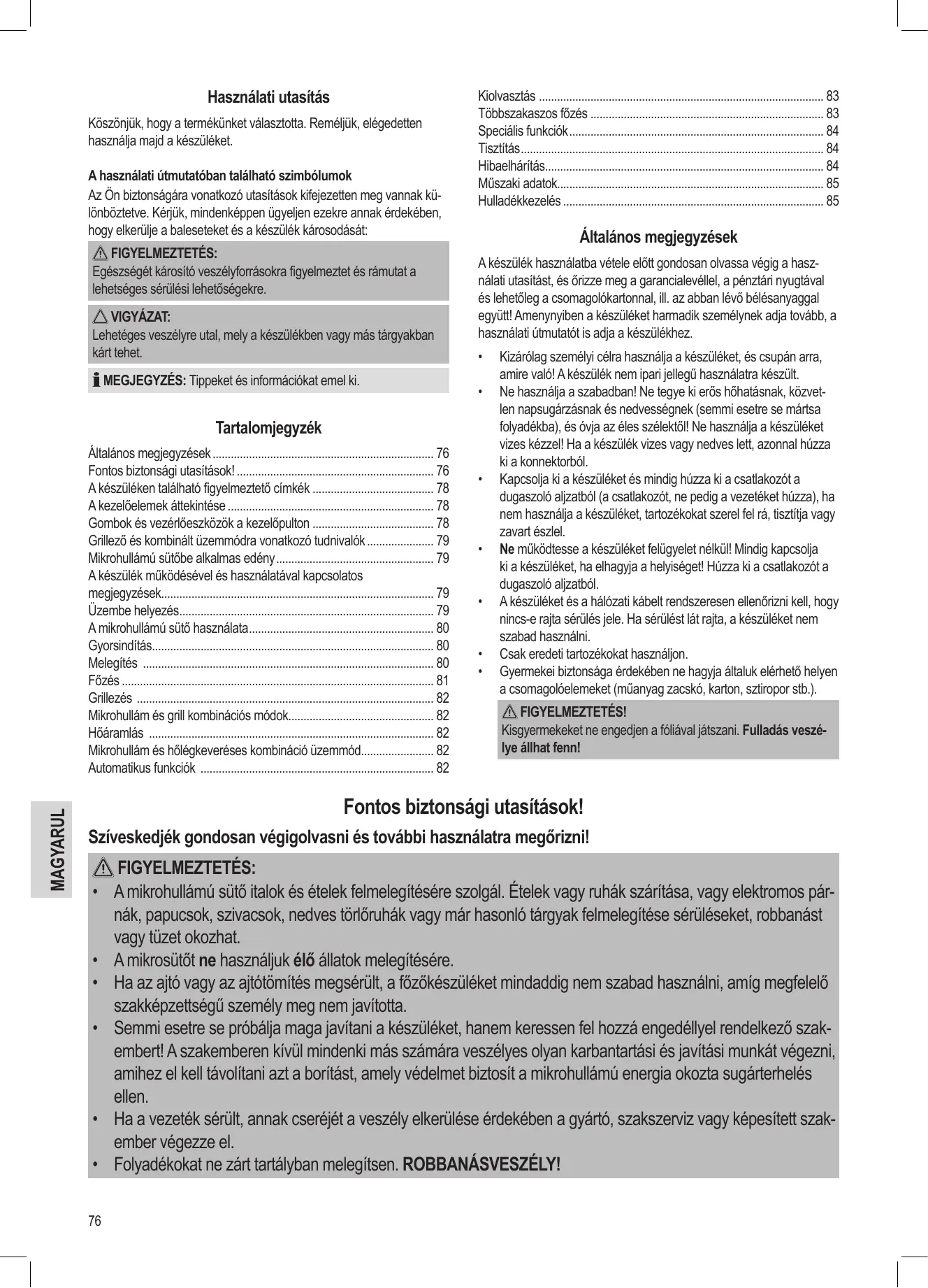 - Fontos biztonsági utasítások! p. 76