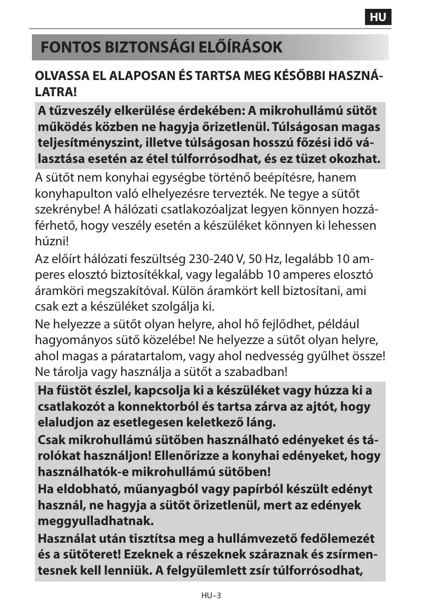 élément de cuisine. Veuillez ne pas placer le four dans un placard. La prise secteur doit être facilement accessible, afin que la fiche du cordon d’alimentation puisse être aisément débranchée en cas d’urgence. La tension d’alimentation doit être égale à 230-240 V, 50 Hz avec un fusible de distribution de 10 A minimum, ou un disjoncteur de 10 A minimum. La prise secteur doit être facilement accessible, afin que la fiche du cordon d’alimentation puisse être aisément débranchée en cas d’urgence. Veuillez ne pas placer votre four à proximité d’une zone génératrice de chaleur. Par exemple, près d’un four à cuisson conventionnelle. Ne placez pas ce four dans une atmosphère à humidité élevée ou bien où l’humidité peut s'accumuler. Ne stockez et n'utilisez pas le four à l’extérieur. Si vous observez la présence de fumée, éteignez ou débranchez le four et laissez la porte fermée afin d’étouffer les flammes. Utilisez uniquement des récipients et ustensiles compatibles avec la cuisson au micro-ondes. Il est important de vérifier que les ustensiles utilisés soient bien compatibles avec la cuisson au micro-ondes. Lorsque vous réchauffez un plat dans un récipient en plasFR – 3