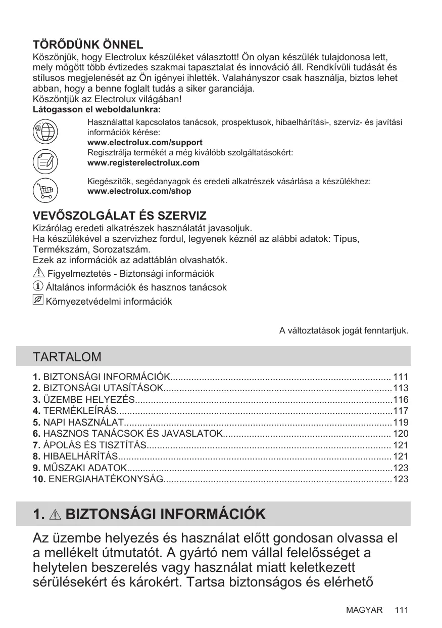 Köszönjük, hogy Electrolux készüléket választott! Ön olyan készülék tulajdonosa lett, mely mögött több évtizedes szakmai tapasztalat és innováció áll. Rendkívüli tudását és stílusos megjelenését az Ön igényei ihlették. Valahányszor csak használja, biztos lehet abban, hogy a benne foglalt tudás a siker garanciája. Köszöntjük az Electrolux világában! Látogasson el weboldalunkra: Használattal kapcsolatos tanácsok, prospektusok, hibaelhárítási-, szerviz- és javítási információk kérése: www.electrolux.com/support Regisztrálja termékét a még kiválóbb szolgáltatásokért: www.registerelectrolux.com Kiegészítők, segédanyagok és eredeti alkatrészek vásárlása a készülékhez: www.electrolux.com/shop