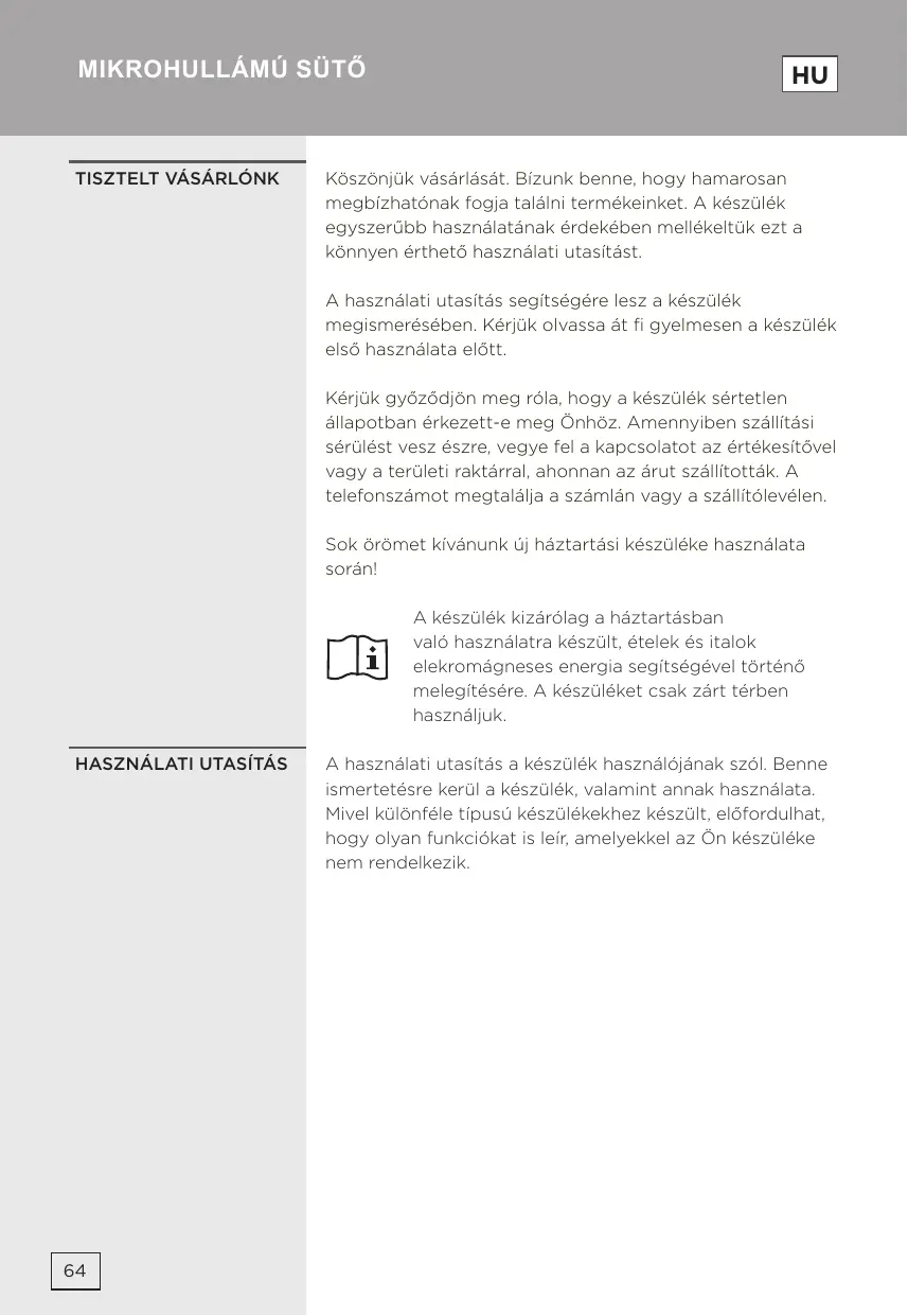 Köszönjük vásárlását. Bízunk benne, hogy hamarosan megbízhatónak fogja találni termékeinket. A készülék egyszerűbb használatának érdekében mellékeltük ezt a könnyen érthető használati utasítást. A használati utasítás segítségére lesz a készülék megismerésében. Kérjük olvassa át fi gyelmesen a készülék első használata előtt. Kérjük győződjön meg róla, hogy a készülék sértetlen állapotban érkezett-e meg Önhöz. Amennyiben szállítási sérülést vesz észre, vegye fel a kapcsolatot az értékesítővel vagy a területi raktárral, ahonnan az árut szállították. A telefonszámot megtalálja a számlán vagy a szállítólevélen. Sok örömet kívánunk új háztartási készüléke használata során! A készülék kizárólag a háztartásban való használatra készült, ételek és italok elekromágneses energia segítségével történő melegítésére. A készüléket csak zárt térben használjuk.