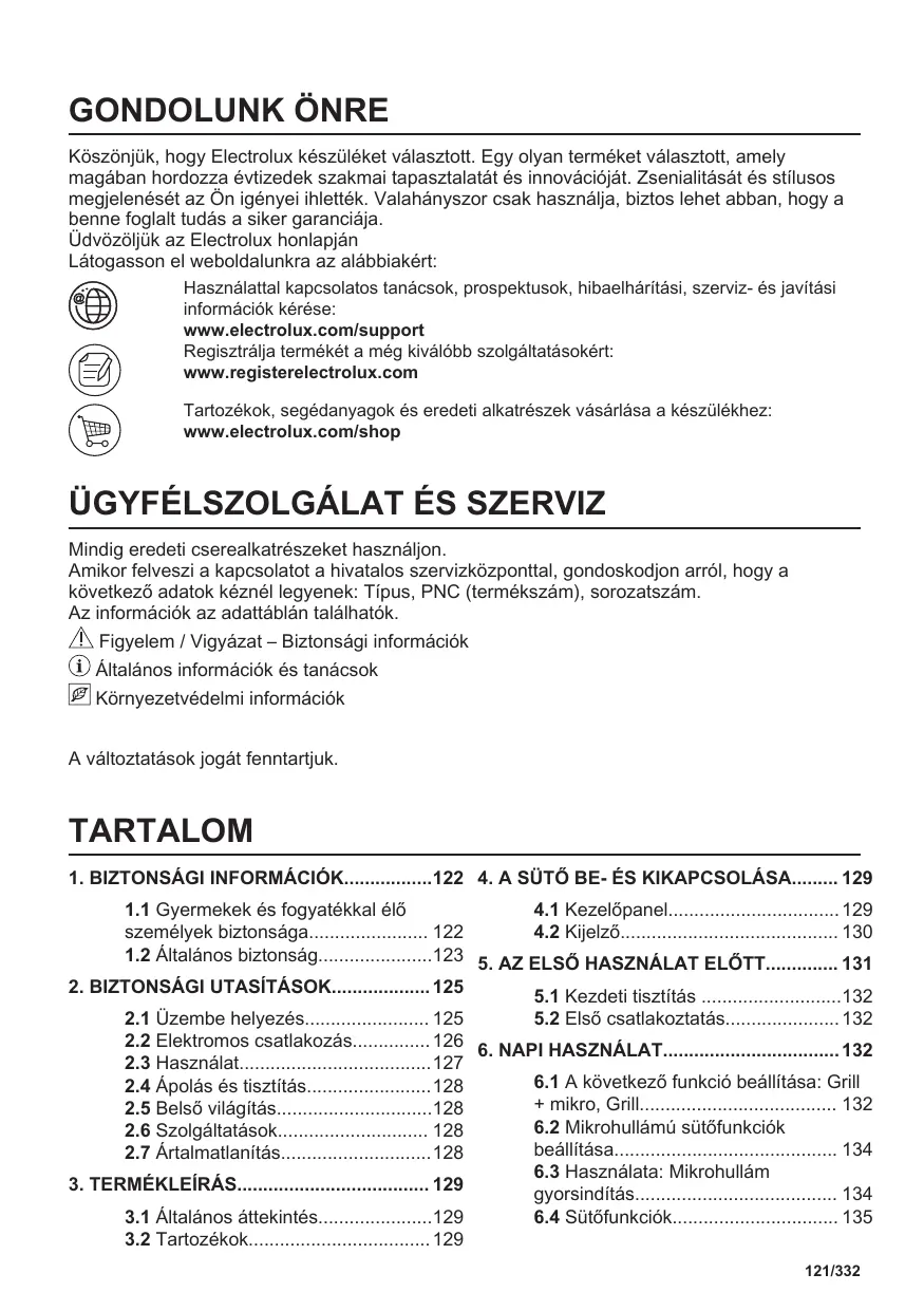 L'ENVIRONNEMENT Recyclez les matériaux portant le symbole . Déposez les emballages dans les conteneurs prévus à cet effet. Contribuez à la protection de l'environnement et à votre sécurité, recyclez vos produits électriques et électroniques. Ne jetez pas les appareils portant le symbole les ordures ménagères. Emmenez un tel produit dans votre centre local de recyclage ou contactez vos services municipaux. Concerne la France uniquement : 120/332 avec GONDOLUNK ÖNRE Köszönjük, hogy Electrolux készüléket választott. Egy olyan terméket választott, amely magában hordozza évtizedek szakmai tapasztalatát és innovációját. Zsenialitását és stílusos megjelenését az Ön igényei ihlették. Valahányszor csak használja, biztos lehet abban, hogy a benne foglalt tudás a siker garanciája. Üdvözöljük az Electrolux honlapján Látogasson el weboldalunkra az alábbiakért: Használattal kapcsolatos tanácsok, prospektusok, hibaelhárítási, szerviz- és javítási információk kérése: www.electrolux.com/support Regisztrálja termékét a még kiválóbb szolgáltatásokért: www.registerelectrolux.com Tartozékok, segédanyagok és eredeti alkatrészek vásárlása a készülékhez: www.electrolux.com/shop