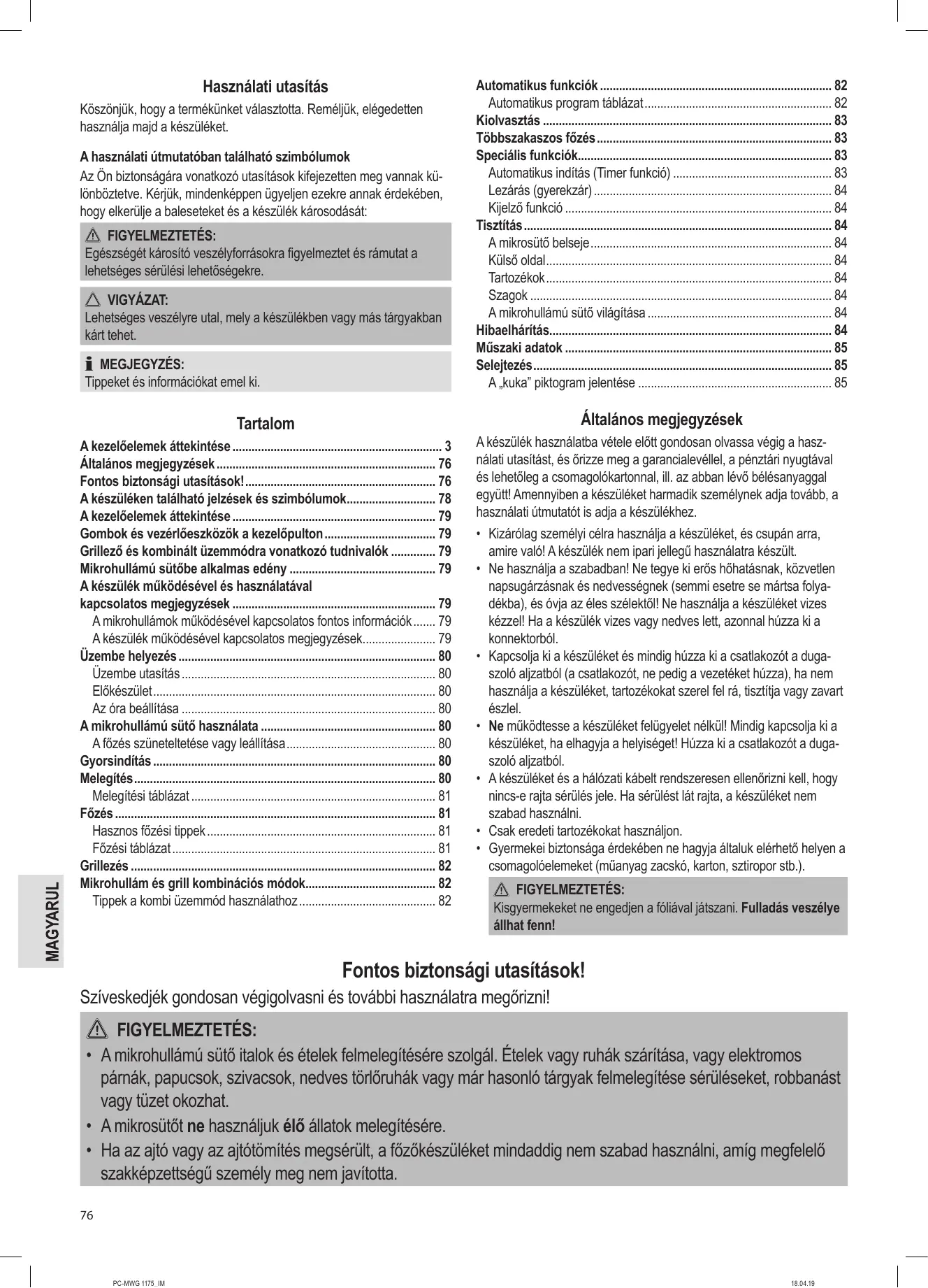 Tartalom A kezelőelemek áttekintése 3 Általános megjegyzések 76 Fontos biztonsági utasítások! 76 A készüléken található jelzések és szimbólumok 78 A kezelőelemek áttekintése 79 Gombok és vezérlőeszközök a kezelőpulton 79 Grillező és kombinált üzemmódra vonatkozó tudnivalók 79 Mikrohullámú sütőbe alkalmas edény 79 A készülék működésével és használatával kapcsolatos megjegyzések 79 A mikrohullámok működésével kapcsolatos fontos információk 79 A készülék működésével kapcsolatos megjegyzések 79 Üzembe helyezés 80 Üzembe utasítás 80 Előkészület 80 Az óra beállítása 80 A mikrohullámú sütő használata 80 A főzés szüneteltetése vagy leállítása 80 Gyorsindítás 80 Melegítés 80 Melegítési táblázat 81 Főzés 81 Hasznos főzési tippek 81 Főzési táblázat 81 Grillezés 82 Mikrohullám és grill kombinációs módok 82 Tippek a kombi üzemmód használathoz 82