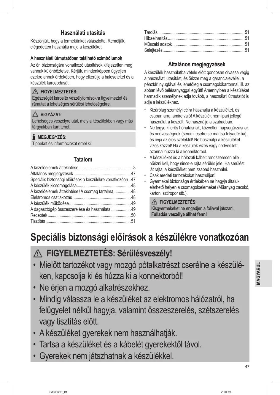 - Speciális biztonsági előírások a készülékre vonatkozóan p. 47