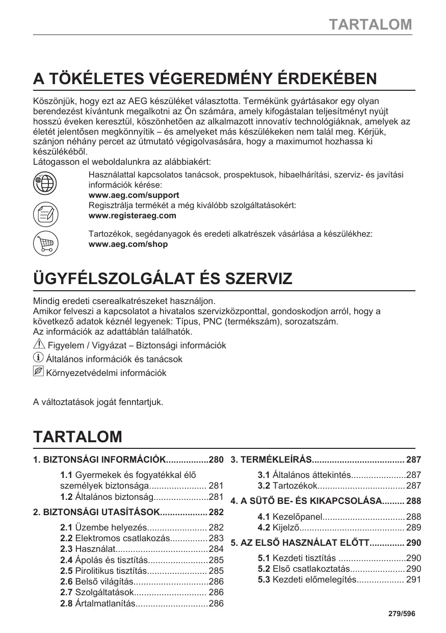 L'ENVIRONNEMENT Recyclez les matériaux portant le symbole . Déposez les emballages dans les conteneurs prévus à cet effet. Contribuez à la protection de l'environnement et à votre sécurité, recyclez vos produits électriques et électroniques. Ne jetez pas les appareils portant le symbole les ordures ménagères. Emmenez un tel produit dans votre centre local de recyclage ou contactez vos services municipaux. avec 277/596 PRENEZ UN RACCOURCI ! 278/596 TARTALOM A TÖKÉLETES VÉGEREDMÉNY ÉRDEKÉBEN Köszönjük, hogy ezt az AEG készüléket választotta. Termékünk gyártásakor egy olyan berendezést kívántunk megalkotni az Ön számára, amely kifogástalan teljesítményt nyújt hosszú éveken keresztül, köszönhetően az alkalmazott innovatív technológiáknak, amelyek az életét jelentősen megkönnyítik – és amelyeket más készülékeken nem talál meg. Kérjük, szánjon néhány percet az útmutató végigolvasására, hogy a maximumot hozhassa ki készülékéből. Látogasson el weboldalunkra az alábbiakért: Használattal kapcsolatos tanácsok, prospektusok, hibaelhárítási, szerviz- és javítási információk kérése: www.aeg.com/support Regisztrálja termékét a még kiválóbb szolgáltatásokért: www.registeraeg.com Tartozékok, segédanyagok és eredeti alkatrészek vásárlása a készülékhez: www.aeg.com/shop