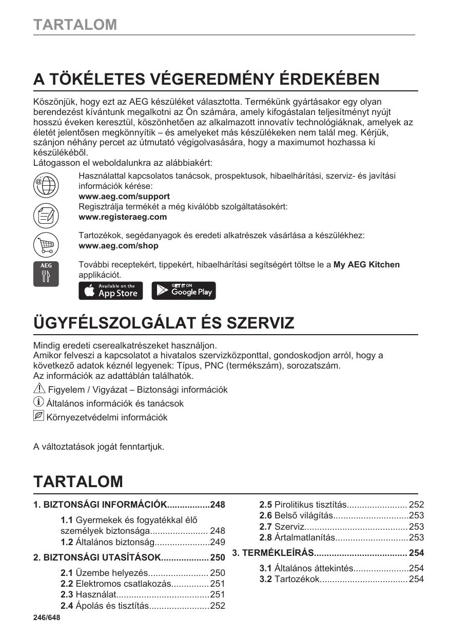 Ανακυκλώστε τα υλικά που φέρουν το σύμβολο . Τοποθετήστε τα υλικά συσκευασίας σε κατάλληλα δοχεία για ανακύκλωση. Συμβάλετε στην προστασία του περιβάλλοντος και της ανθρώπινης υγείας ανακυκλώνοντας τις άχρηστες ηλεκτρικές και ηλεκτρονικές συσκευές. Μην απορρίπτετε με τα οικιακά απορρίμματα συσκευές που φέρουν το σύμβολο . Επιστρέψτε το προϊόν στην τοπική σας μονάδα ανακύκλωσης ή επικοινωνήστε με τη δημοτική αρχή. 245/648 TARTALOM A TÖKÉLETES VÉGEREDMÉNY ÉRDEKÉBEN Köszönjük, hogy ezt az AEG készüléket választotta. Termékünk gyártásakor egy olyan berendezést kívántunk megalkotni az Ön számára, amely kifogástalan teljesítményt nyújt hosszú éveken keresztül, köszönhetően az alkalmazott innovatív technológiáknak, amelyek az életét jelentősen megkönnyítik – és amelyeket más készülékeken nem talál meg. Kérjük, szánjon néhány percet az útmutató végigolvasására, hogy a maximumot hozhassa ki készülékéből. Látogasson el weboldalunkra az alábbiakért: Használattal kapcsolatos tanácsok, prospektusok, hibaelhárítási, szerviz- és javítási információk kérése: www.aeg.com/support Regisztrálja termékét a még kiválóbb szolgáltatásokért: www.registeraeg.com Tartozékok, segédanyagok és eredeti alkatrészek vásárlása a készülékhez: www.aeg.com/shop További receptekért, tippekért, hibaelhárítási segítségért töltse le a My AEG Kitchen applikációt.