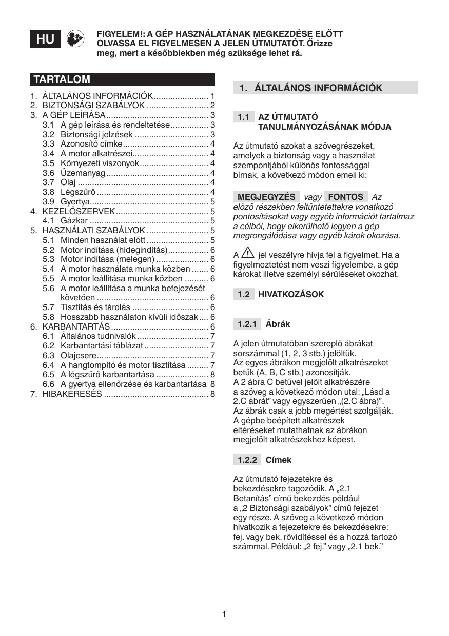 A gép használatának megkezdése előtt olvassa el figyelmesen a jelen utasításokat. Ismerkedjen meg a kezelőszervek és a gép működésével. Tanulja meg, hogyan lehet a motort gyorsan leállítani. A figyelmeztetések és utasítások megszegése súlyos károkat illetve sérüléseket okozhat. Őrizze meg az útmutatót egy későbbi konzultáció céljából.