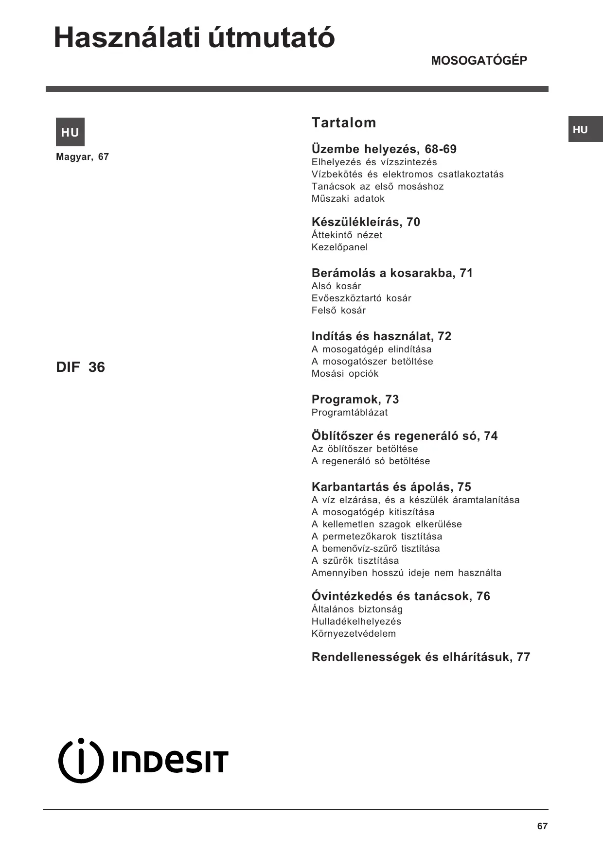HASZNÁLATI ÚTMUTATÓ D 36A INDESIT