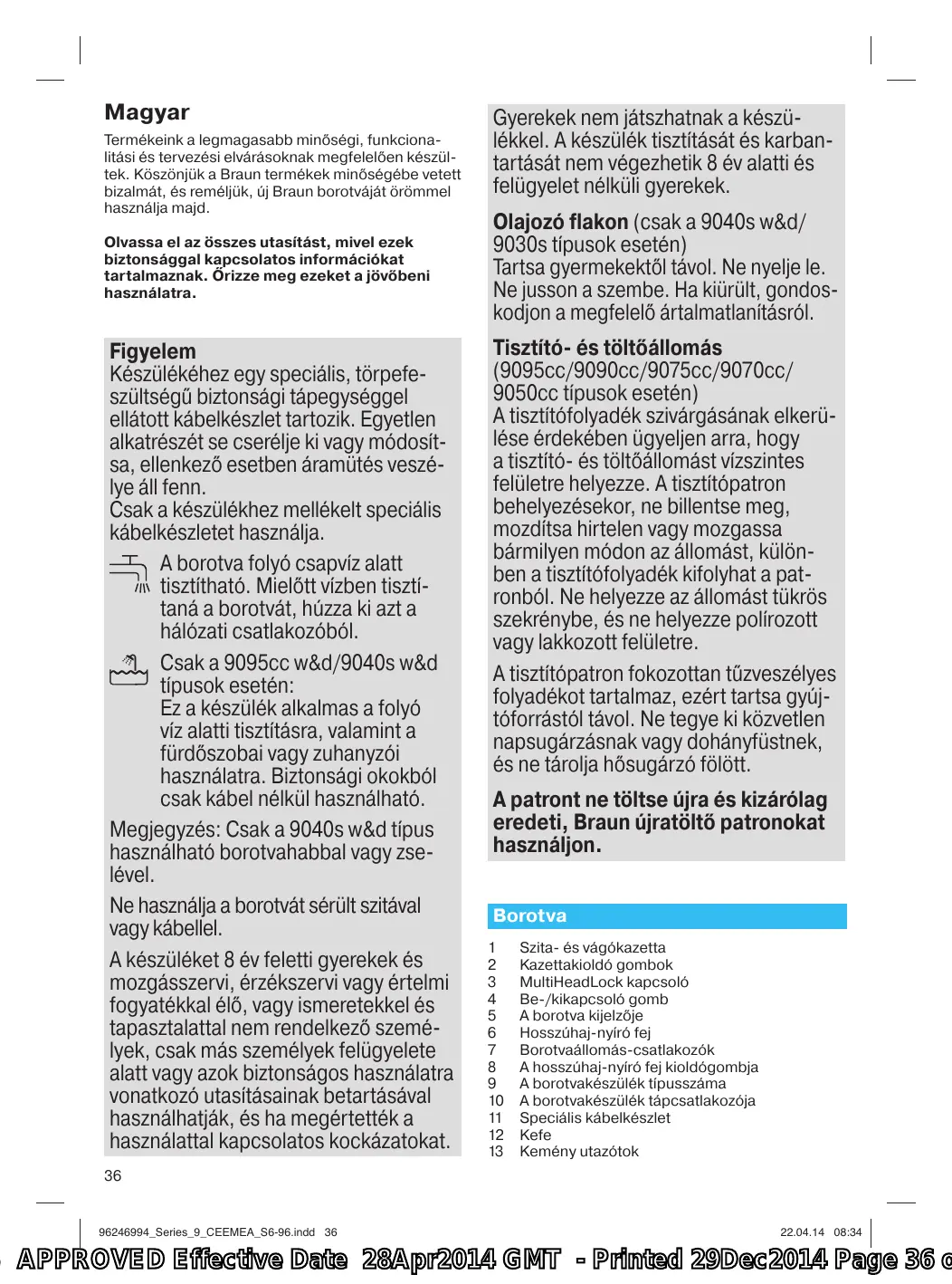 Gyerekek nem játszhatnak a készülékkel. A készülék tisztítását és karbantartását nem végezhetik 8 év alatti és felügyelet nélküli gyerekek. Olajozó flakon (csak a 9040s w&d/ 9030s típusok esetén) Tartsa gyermekektől távol. Ne nyelje le. Ne jusson a szembe. Ha kiürült, gondoskodjon a megfelelő ártalmatlanításról. Tisztító- és töltőállomás (9095cc/9090cc/9075cc/9070cc/ 9050cc típusok esetén) A tisztítófolyadék szivárgásának elkerülése érdekében ügyeljen arra, hogy a tisztító- és töltőállomást vízszintes felületre helyezze. A tisztítópatron behelyezésekor, ne billentse meg, mozdítsa hirtelen vagy mozgassa bármilyen módon az állomást, különben a tisztítófolyadék kifolyhat a patronból. Ne helyezze az állomást tükrös szekrénybe, és ne helyezze polírozott vagy lakkozott felületre. A tisztítópatron fokozottan tűzveszélyes folyadékot tartalmaz, ezért tartsa gyújtóforrástól távol. Ne tegye ki közvetlen napsugárzásnak vagy dohányfüstnek, és ne tárolja hősugárzó fölött. A patront ne töltse újra és kizárólag eredeti, Braun újratöltő patronokat használjon. Borotva 1 2 3 4 5 6 7 8 9 10 11 12 13