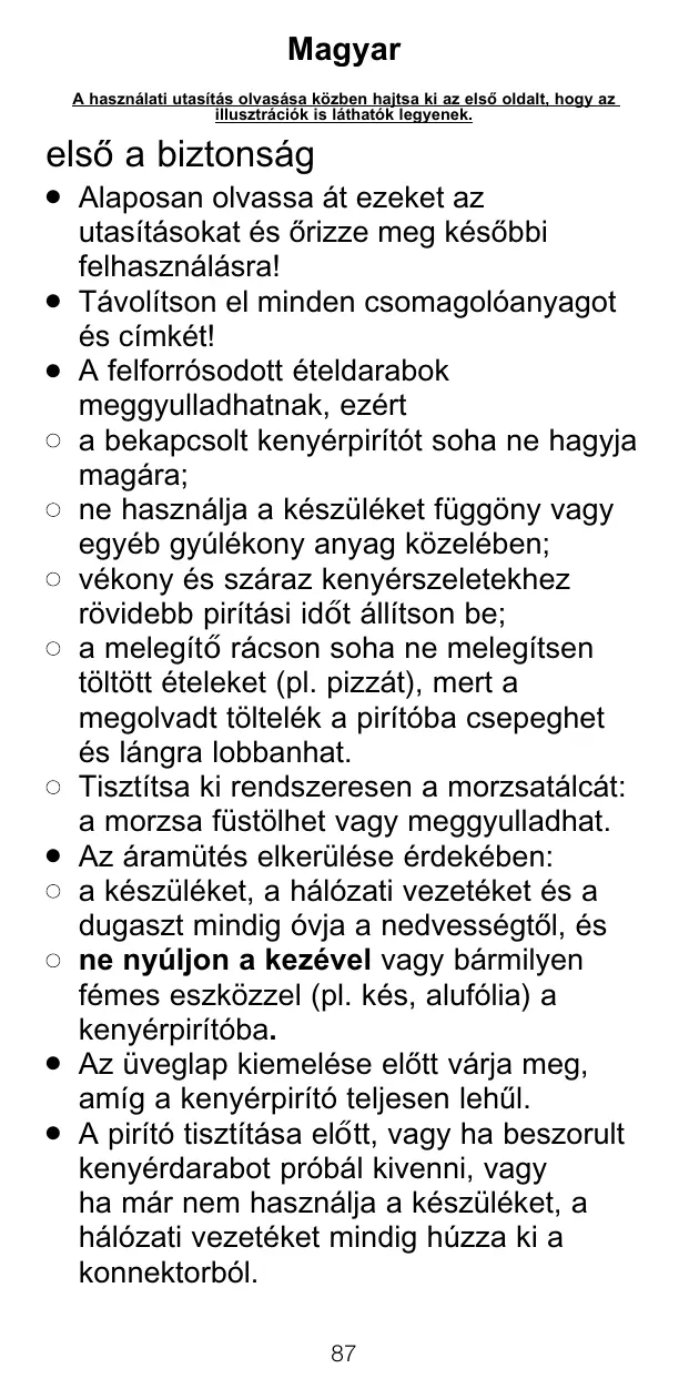 Ne laissez jamais votre grille-pain sans surveillance ; Éloignez toujours votre grille-pain des matières inflammables (par exemple, des rideaux) ; Choisissez la position minimum pour griller une tranche fine ou du pain rassis ; Ne réchauffez jamais des aliments fourrés ou garnis (comme une pizza) : ils pourraient couler et prendre feu. Nettoyez régulièrement le plateau ramassemiettes : les miettes peuvent fumer ou brûler. Pour éviter une électrocution, veillez à ne jamais : mouiller le grille-pain, le cordon ou la prise ; ou introduire vos mains ou tout élément métallique, comme un couteau ou du papier d’aluminium, dans le grille-pain. Laissez le grille-pain complètement refroidir avant de retirer la plaque de verre. Débranchez toujours votre grille-pain quand vous ne l’utilisez pas et avant de le nettoyer ou de tenter de dégager une tartine coincée. 15