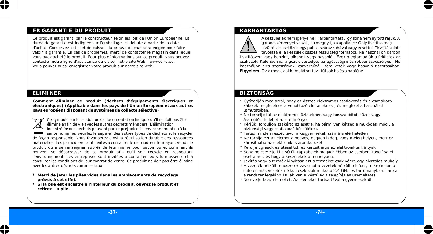 Erre a termékre gyärj jöttälst bitzositunk az EU szabályozások szerint. A jôttálas a csmagoláson fel计提etett számú évg tá, a vásárlás id pontjától kezd d en. rízze meg a nyugtá - a vásárlás igazolása szüksegés a jôttálas érvényéséhéz. Problema eseten fordljon az uzlethécz, ahol a terméket vásárolta. További tajékoztatásert a termékr hívja forrovnalunkat vagy latogassel honlapunkra: www.elro.eu. A vásárolt terméket is it regsztrálhatja.