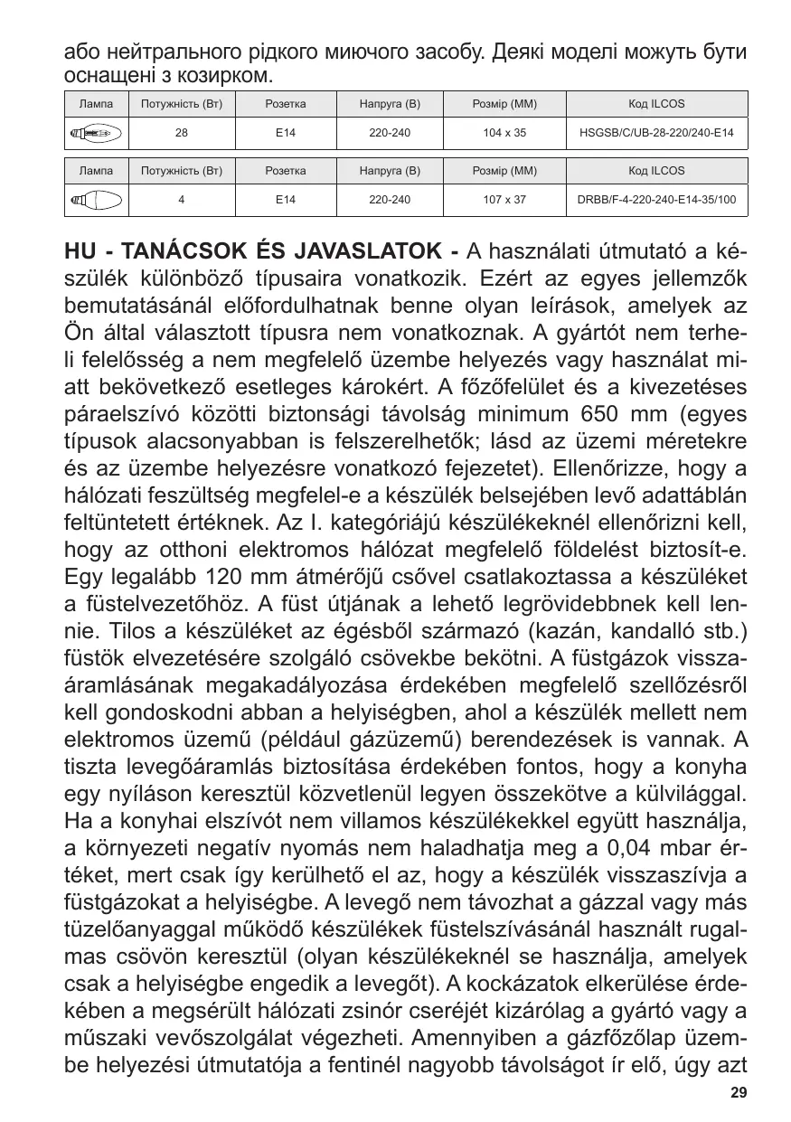 szolgálni. Mielőtt bármilyen tisztítási vagy karbantartási műveletre sor kerülne, fontos a készülék kikapcsolása vagy áramtalanítása. Az előírt időtartam lejárata után tisztítsa meg és/vagy cserélje ki a szűrőket (tűzveszély). „Tűzveszély lép fel, ha a tisztítást nem az utasításoknak megfelelően végzik”. A zsírszűrők 2 havonta vagy – nagyon intenzív használat esetén – ennél gyakrabban tisztítandók, és mosogatógépben is tisztíthatók (Z). Nem mosható és nem regenerálható, hanem kb. 2 havonta vagy – nagyon intenzív használat esetén – ennél gyakrabban cserélendő (H). Mivel az aktív szénszűrő nem mosható és nem regenerálható, ezért az 4 havonta vagy – nagyon intenzív használat esetén – még gyakrabban cserélendő (W). A készüléket nedves ruhával és semleges kémhatású folyékony tisztítószerrel kell tisztítani. Egyes modellek rostéllyal rendelkezhetnek. Izzó Izzó Elszívási teljesítmény (W) Csatlakozó Feszültség (V) Méret (mm) ILCOS kód