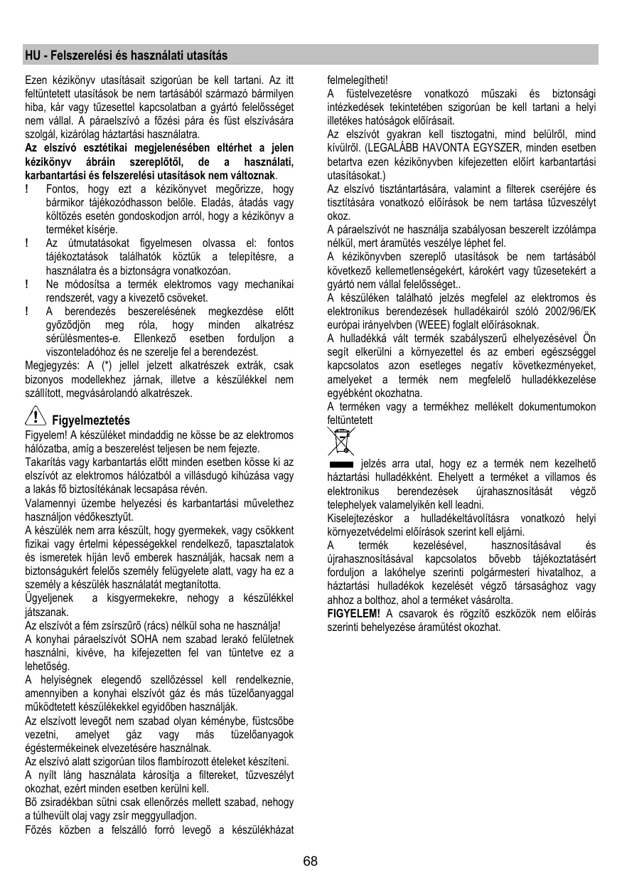 felmelegítheti! A füstelvezetésre vonatkozó műszaki és biztonsági intézkedések tekintetében szigorúan be kell tartani a helyi illetékes hatóságok előírásait. Az elszívót gyakran kell tisztogatni, mind belülről, mind kívülről. (LEGALÁBB HAVONTA EGYSZER, minden esetben betartva ezen kézikönyvben kifejezetten előírt karbantartási utasításokat.) Az elszívó tisztántartására, valamint a filterek cseréjére és tisztítására vonatkozó előírások be nem tartása tűzveszélyt okoz. A páraelszívót ne használja szabályosan beszerelt izzólámpa nélkül, mert áramütés veszélye léphet fel. A kézikönyvben szereplő utasítások be nem tartásából következő kellemetlenségekért, károkért vagy tűzesetekért a gyártó nem vállal felelősséget.. A készüléken található jelzés megfelel az elektromos és elektronikus berendezések hulladékairól szóló 2002/96/EK európai irányelvben (WEEE) foglalt előírásoknak. A hulladékká vált termék szabályszerű elhelyezésével Ön segít elkerülni a környezettel és az emberi egészséggel kapcsolatos azon esetleges negatív következményeket, amelyeket a termék nem megfelelő hulladékkezelése egyébként okozhatna. A terméken vagy a termékhez mellékelt dokumentumokon feltüntetett