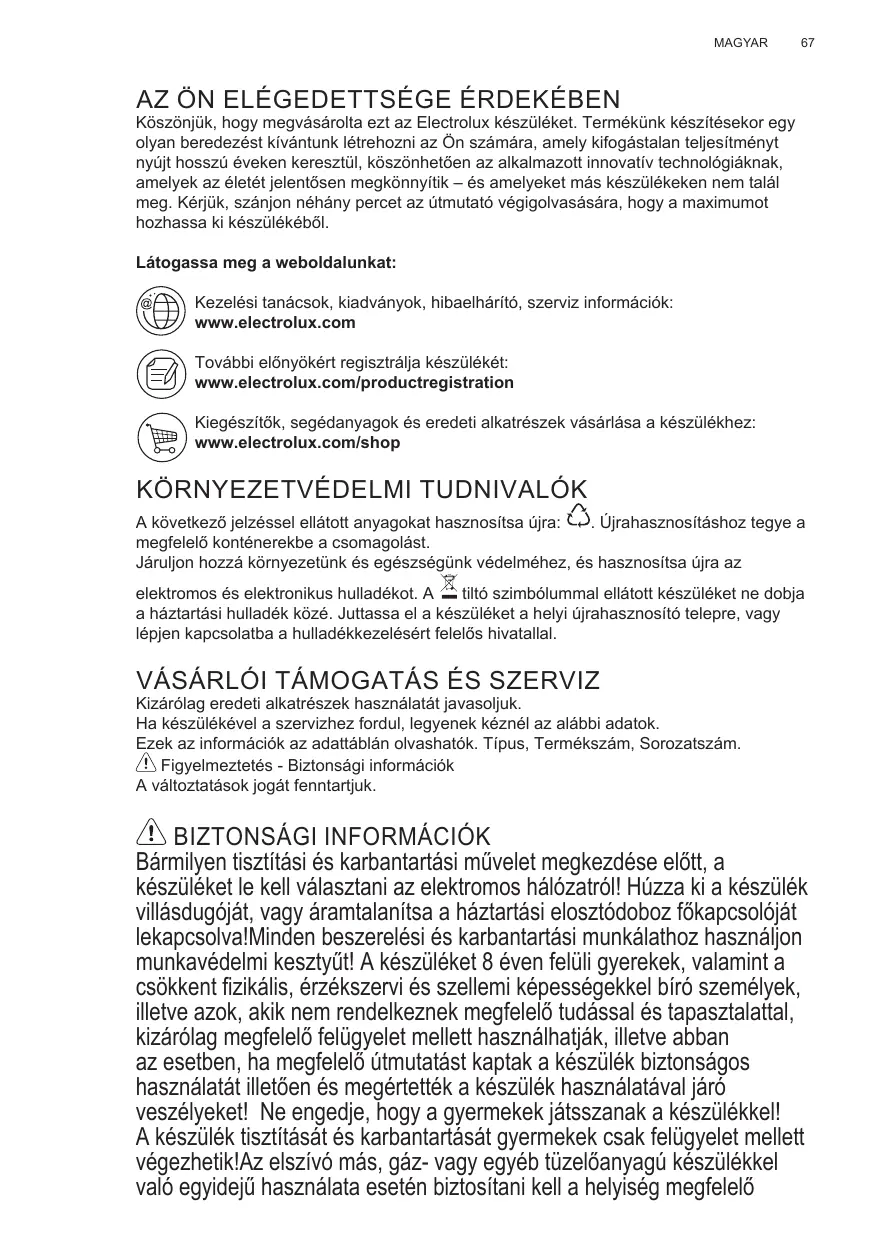 AZ ÖN ELÉGEDETTSÉGE ÉRDEKÉBEN Köszönjük, hogy megvásárolta ezt az Electrolux készüléket. Termékünk készítésekor egy olyan beredezést kívántunk létrehozni az Ön számára, amely kifogástalan teljesítményt nyújt hosszú éveken keresztül, köszönhetően az alkalmazott innovatív technológiáknak, amelyek az életét jelentősen megkönnyítik – és amelyeket más készülékeken nem talál meg. Kérjük, szánjon néhány percet az útmutató végigolvasására, hogy a maximumot hozhassa ki készülékéből. Látogassa meg a weboldalunkat: Kezelési tanácsok, kiadványok, hibaelhárító, szerviz információk: www.electrolux.com További előnyökért regisztrálja készülékét: www.electrolux.com/productregistration Kiegészítők, segédanyagok és eredeti alkatrészek vásárlása a készülékhez: www.electrolux.com/shop