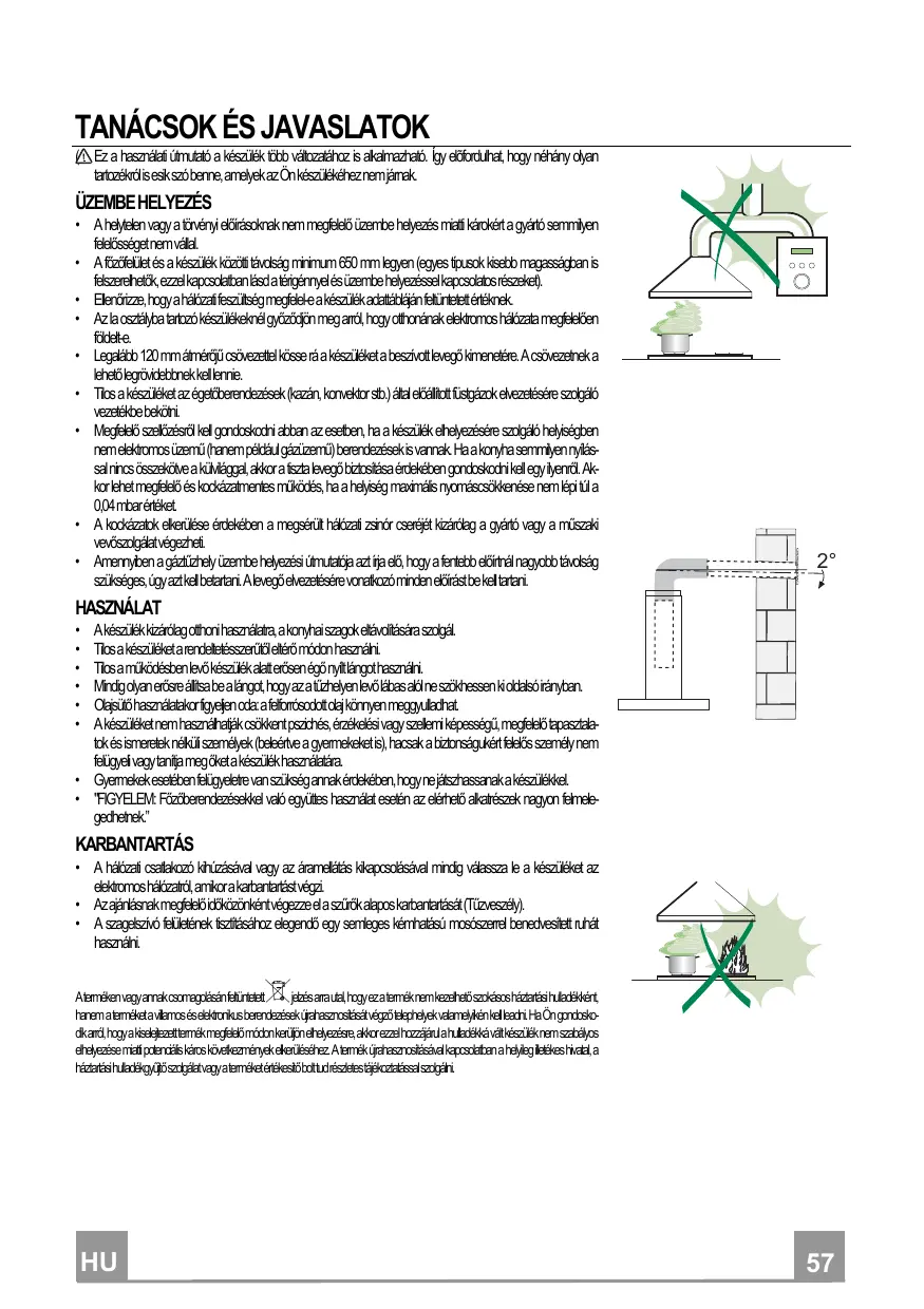 • Connecter la hotte à la sortie d’air aspiré à l’aide d’une tuyauterie d’un diamètre égal ou supérieur à 120 mm. Le parcours de latuyauteriedoit être le pluscourt possible. • Ne pas connecter la hotte à des conduites d’évacuation de fumées issues d’une combustion tel que (Chaudière, cheminée,etc…). • Si vous utilisez des appareils qui ne fonctionnent pas à l’électricité dans la pièce ou est installée la hotte (par exemple: des appareils fonctionnant au gaz), vous devez prévoir une aération suffisante du milieu. Si la cuisine en est dépourvue, pratiquez une ouverture qui communique avec l’extérieur pour garantir l’infiltration de l’air pur. Pour un emploi correct et sans risque,ladépressionmaximumdanslapièce ne doitpasdépasser 0,04mbar. • En cas d’endommagement du cordon d’alimentation, faites-le remplacer par le constructeur ou par le service après-vente, afindeprévenirtoutrisque. • Si les instructions de montage pour la plaque de cuisson au gaz spécifient une plus grande distance indiquée ci-dessus, celadoit êtreprisencompte.Règlementconcernant l'évacuation d'airdoivent être remplies..