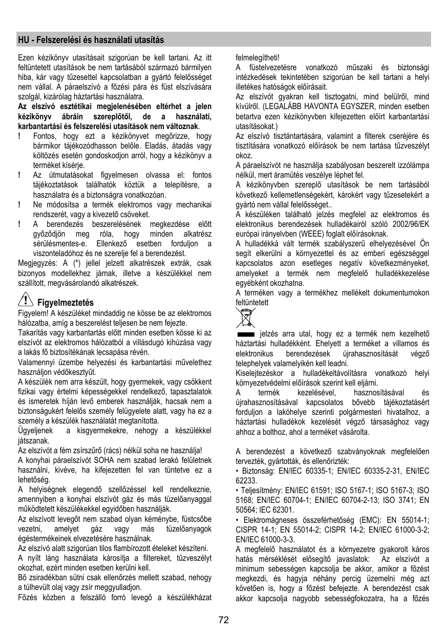 HU - Felszerelési és használati utasítás Ezen kézikönyv utasításait szigorúan be kell tartani. Az itt feltüntetett utasítások be nem tartásából származó bármilyen hiba, kár vagy tűzesettel kapcsolatban a gyártó felelősséget nem vállal. A páraelszívó a főzési pára és füst elszívására szolgál, kizárólag háztartási használatra. Az elszívó esztétikai megjelenésében eltérhet a jelen kézikönyv ábráin szereplőtől, de a használati, karbantartási és felszerelési utasítások nem változnak. Fontos, hogy ezt a kézikönyvet megőrizze, hogy bármikor tájékozódhasson belőle. Eladás, átadás vagy költözés esetén gondoskodjon arról, hogy a kézikönyv a terméket kísérje. Az útmutatásokat figyelmesen olvassa el: fontos tájékoztatások találhatók köztük a telepítésre, a használatra és a biztonságra vonatkozóan. Ne módosítsa a termék elektromos vagy mechanikai rendszerét, vagy a kivezető csöveket. A berendezés beszerelésének megkezdése előtt győződjön meg róla, hogy minden alkatrész sérülésmentes-e. Ellenkező esetben forduljon a viszonteladóhoz és ne szerelje fel a berendezést. Megjegyzés: A (*) jellel jelzett alkatrészek extrák, csak bizonyos modellekhez járnak, illetve a készülékkel nem szállított, megvásárolandó alkatrészek. felmelegítheti! A füstelvezetésre vonatkozó műszaki és biztonsági intézkedések tekintetében szigorúan be kell tartani a helyi illetékes hatóságok előírásait. Az elszívót gyakran kell tisztogatni, mind belülről, mind kívülről. (LEGALÁBB HAVONTA EGYSZER, minden esetben betartva ezen kézikönyvben kifejezetten előírt karbantartási utasításokat.) Az elszívó tisztántartására, valamint a filterek cseréjére és tisztítására vonatkozó előírások be nem tartása tűzveszélyt okoz. A páraelszívót ne használja szabályosan beszerelt izzólámpa nélkül, mert áramütés veszélye léphet fel. A kézikönyvben szereplő utasítások be nem tartásából következő kellemetlenségekért, károkért vagy tűzesetekért a gyártó nem vállal felelősséget.. A készüléken található jelzés megfelel az elektromos és elektronikus berendezések hulladékairól szóló 2002/96/EK európai irányelvben (WEEE) foglalt előírásoknak. A hulladékká vált termék szabályszerű elhelyezésével Ön segít elkerülni a környezettel és az emberi egészséggel kapcsolatos azon esetleges negatív következményeket, amelyeket a termék nem megfelelő hulladékkezelése egyébként okozhatna. A terméken vagy a termékhez mellékelt dokumentumokon feltüntetett Figyelmeztetés Figyelem! A készüléket mindaddig ne kösse be az elektromos hálózatba, amíg a beszerelést teljesen be nem fejezte. Takarítás vagy karbantartás előtt minden esetben kösse ki az elszívót az elektromos hálózatból a villásdugó kihúzása vagy a lakás fő biztosítékának lecsapása révén. Valamennyi üzembe helyezési és karbantartási művelethez használjon védőkesztyűt. A készülék nem arra készült, hogy gyermekek, vagy csökkent fizikai vagy értelmi képességekkel rendelkező, tapasztalatok és ismeretek híján levő emberek használják, hacsak nem a biztonságukért felelős személy felügyelete alatt, vagy ha ez a személy a készülék használatát megtanította. Ügyeljenek a kisgyermekekre, nehogy a készülékkel játszanak. Az elszívót a fém zsírszűrő (rács) nélkül soha ne használja! A konyhai páraelszívót SOHA nem szabad lerakó felületnek használni, kivéve, ha kifejezetten fel van tüntetve ez a lehetőség. A helyiségnek elegendő szellőzéssel kell rendelkeznie, amennyiben a konyhai elszívót gáz és más tüzelőanyaggal működtetett készülékekkel egyidőben használják. Az elszívott levegőt nem szabad olyan kéménybe, füstcsőbe vezetni, amelyet gáz vagy más tüzelőanyagok égéstermékeinek elvezetésére használnak. Az elszívó alatt szigorúan tilos flambírozott ételeket készíteni. A nyílt láng használata károsítja a filtereket, tűzveszélyt okozhat, ezért minden esetben kerülni kell. Bő zsiradékban sütni csak ellenőrzés mellett szabad, nehogy a túlhevült olaj vagy zsír meggyulladjon. Főzés közben a felszálló forró levegő a készülékházat jelzés arra utal, hogy ez a termék nem kezelhető háztartási hulladékként. Ehelyett a terméket a villamos és elektronikus berendezések újrahasznosítását végző telephelyek valamelyikén kell leadni. Kiselejtezéskor a hulladékeltávolításra vonatkozó helyi környezetvédelmi előírások szerint kell eljárni. termék kezelésével, hasznosításával újrahasznosításával kapcsolatos bővebb tájékoztatásért forduljon a lakóhelye szerinti polgármesteri hivatalhoz, a háztartási hulladékok kezelését végző társasághoz vagy ahhoz a bolthoz, ahol a terméket vásárolta. A berendezést a következő szabványoknak megfelelően tervezték, gyártották, és ellenőrizték: