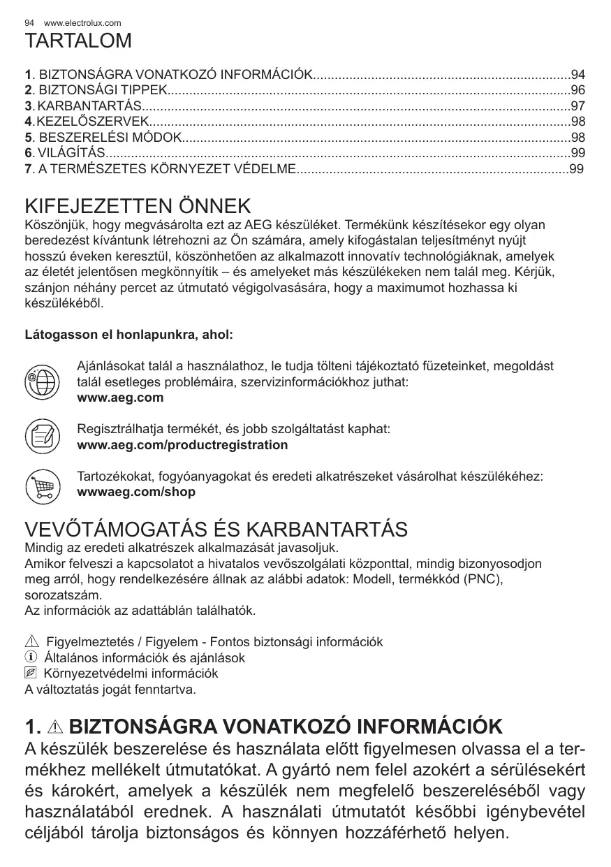 KIFEJEZETTEN ÖNNEK Köszönjük, hogy megvásárolta ezt az AEG készüléket. Termékünk készítésekor egy olyan beredezést kívántunk létrehozni az Ön számára, amely kifogástalan teljesítményt nyújt hosszú éveken keresztül, köszönhetően az alkalmazott innovatív technológiáknak, amelyek az életét jelentősen megkönnyítik – és amelyeket más készülékeken nem talál meg. Kérjük, szánjon néhány percet az útmutató végigolvasására, hogy a maximumot hozhassa ki készülékéből. Látogasson el honlapunkra, ahol: Ajánlásokat talál a használathoz, le tudja tölteni tájékoztató füzeteinket, megoldást talál esetleges problémáira, szervizinformációkhoz juthat: www.aeg.com Regisztrálhatja termékét, és jobb szolgáltatást kaphat: www.aeg.com/productregistration Tartozékokat, fogyóanyagokat és eredeti alkatrészeket vásárolhat készülékéhez: wwwaeg.com/shop