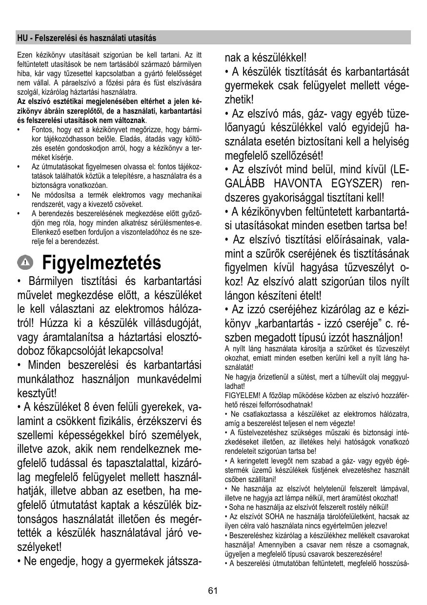 - Az elszívó tisztítási előírásainak, valamint a szűrők cseréjének és tisztításának figyelmen kívül hagyása tűzveszélyt okoz! Az elszívó alatt szigorúan tilos nyílt lángon készíteni ételt!