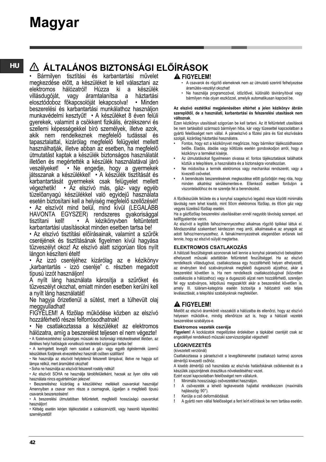 • La pièce doit avoir une aération suffisante lorsque la hotte est utilisée conjointement avec d'autres appareils fonctionnant au gaz ou autres combustibles. • La hotte doit être régulièrement nettoyée à la fois à l'intérieur et à l'extérieur (AU MOINS UNE FOIS PAR MOIS); cela devrait se faire en conformité avec les instructions d'entretien. Le non respect des instructions expressément fournies concernant le nettoyage de la hotte et des filtres peut provoquer des risques d'incendie. • Ne pas flamber d’aliments sous la hotte. • Pour le remplacement de la lampe, utilisez uniquement le type de lampe spécifié dans la section remplacement/maintenance lampe dans ce manuel. L'utilisation d'une flamme nue est dommageable pour les filtres et peut causer un incendie, par conséquent, il est déconseillé de l'utiliser. La friture doit être faite avec soin afin de s’assurer que l’huile surchauffée ne prenne pas feu. AVERTISSEMENT: Lorsque la table de cuisson est en fonctionnement, les parties accessibles de la hotte peuvent devenir très chaudes. • Ne pas brancher l'appareil au réseau électrique avant que l'installation est complètement terminée.