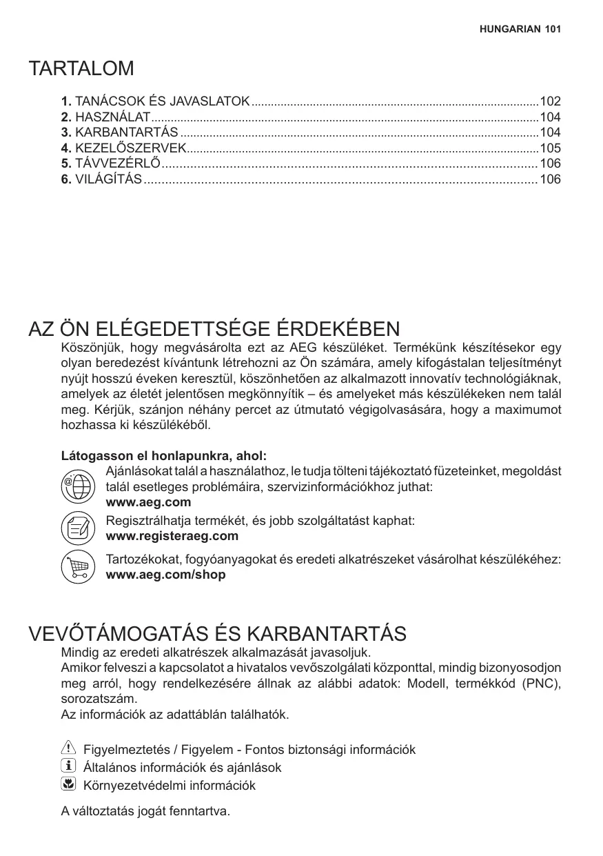 • 6. VILÁGÍTÁS AZ ÖN ELÉGEDETTSÉGE ÉRDEKÉBEN Köszönjük, hogy megvásárolta ezt az AEG készüléket. Termékünk készítésekor egy olyan beredezést kívántunk létrehozni az Ön számára, amely kifogástalan teljesítményt nyújt hosszú éveken keresztül, köszönhetően az alkalmazott innovatív technológiáknak, amelyek az életét jelentősen megkönnyítik – és amelyeket más készülékeken nem talál meg. Kérjük, szánjon néhány percet az útmutató végigolvasására, hogy a maximumot hozhassa ki készülékéből. Látogasson el honlapunkra, ahol: Ajánlásokat talál a használathoz, le tudja tölteni tájékoztató füzeteinket, megoldást talál esetleges problémáira, szervizinformációkhoz juthat: www.aeg.com Regisztrálhatja termékét, és jobb szolgáltatást kaphat: www.registeraeg.com Tartozékokat, fogyóanyagokat és eredeti alkatrészeket vásárolhat készülékéhez: www.aeg.com/shop VEVŐTÁMOGATÁS ÉS KARBANTARTÁS Mindig az eredeti alkatrészek alkalmazását javasoljuk. Amikor felveszi a kapcsolatot a hivatalos vevőszolgálati központtal, mindig bizonyosodjon meg arról, hogy rendelkezésére állnak az alábbi adatok: Modell, termékkód (PNC), sorozatszám. Az információk az adattáblán találhatók. Figyelmeztetés / Figyelem - Fontos biztonsági információk Általános információk és ajánlások Környezetvédelmi információk A változtatás jogát fenntartva. 102 www.aeg.com p. 106