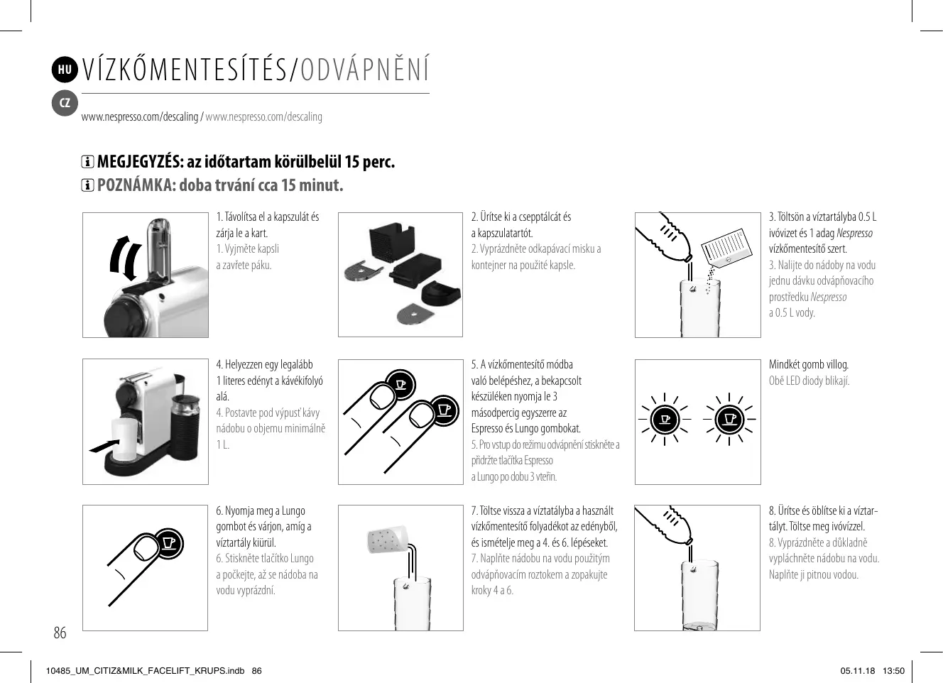 HU CZ VÍZKŐMENTESÍTÉS/ODVÁPNĚNÍ www.nespresso.com/descaling / www.nespresso.com/descaling