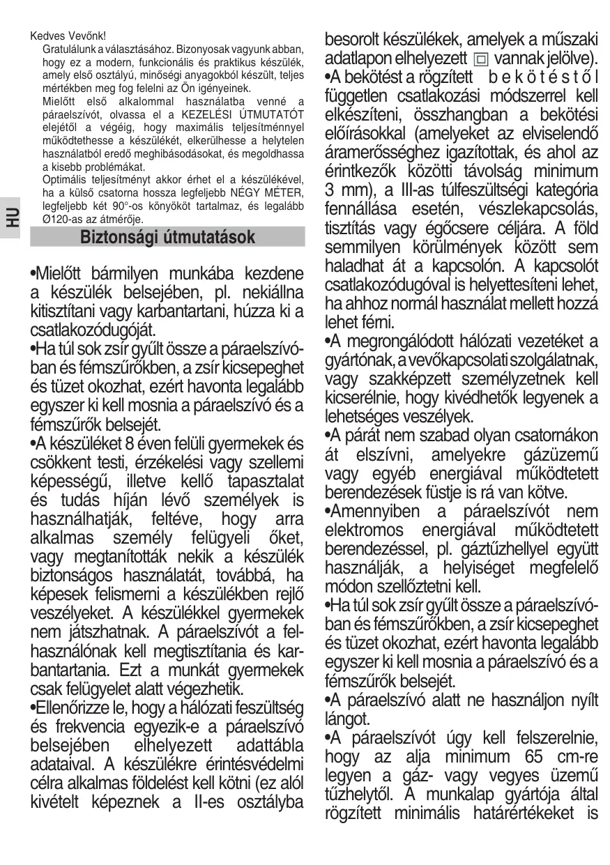 besorolt készülékek, amelyek a műszaki adatlapon elhelyezett vannak jelölve). •A bekötést a rögzített b e k ö t é s t ő l független csatlakozási módszerrel kell elkészíteni, összhangban a bekötési előírásokkal (amelyeket az elviselendő áramerősséghez igazítottak, és ahol az érintkezők közötti távolság minimum 3 mm), a III-as túlfeszültségi kategória fennállása esetén, vészlekapcsolás, tisztítás vagy égőcsere céljára. A föld semmilyen körülmények között sem haladhat át a kapcsolón. A kapcsolót csatlakozódugóval is helyettesíteni lehet, ha ahhoz normál használat mellett hozzá lehet férni. •A megrongálódott hálózati vezetéket a gyártónak, a vevőkapcsolati szolgálatnak, vagy szakképzett személyzetnek kell kicserélnie, hogy kivédhetők legyenek a lehetséges veszélyek. •A párát nem szabad olyan csatornákon át elszívni, amelyekre gázüzemű vagy egyéb energiával működtetett berendezések füstje is rá van kötve. •Amennyiben a páraelszívót nem elektromos energiával működtetett berendezéssel, pl. gáztűzhellyel együtt használják, a helyiséget megfelelő módon szellőztetni kell. •Ha túl sok zsír gyűlt össze a páraelszívó ban és fémszűrőkben, a zsír kicsepeghet és tüzet okozhat, ezért havonta legalább egyszer ki kell mosnia a páraelszívó és a fémszűrők belsejét. •A páraelszívó alatt ne használjon nyílt lángot. •A páraelszívót úgy kell felszerelnie, hogy az alja minimum 65 cm-re legyen a gáz- vagy vegyes üzemű tűzhelytől. A munkalap gyártója által rögzített minimális határértékeket is