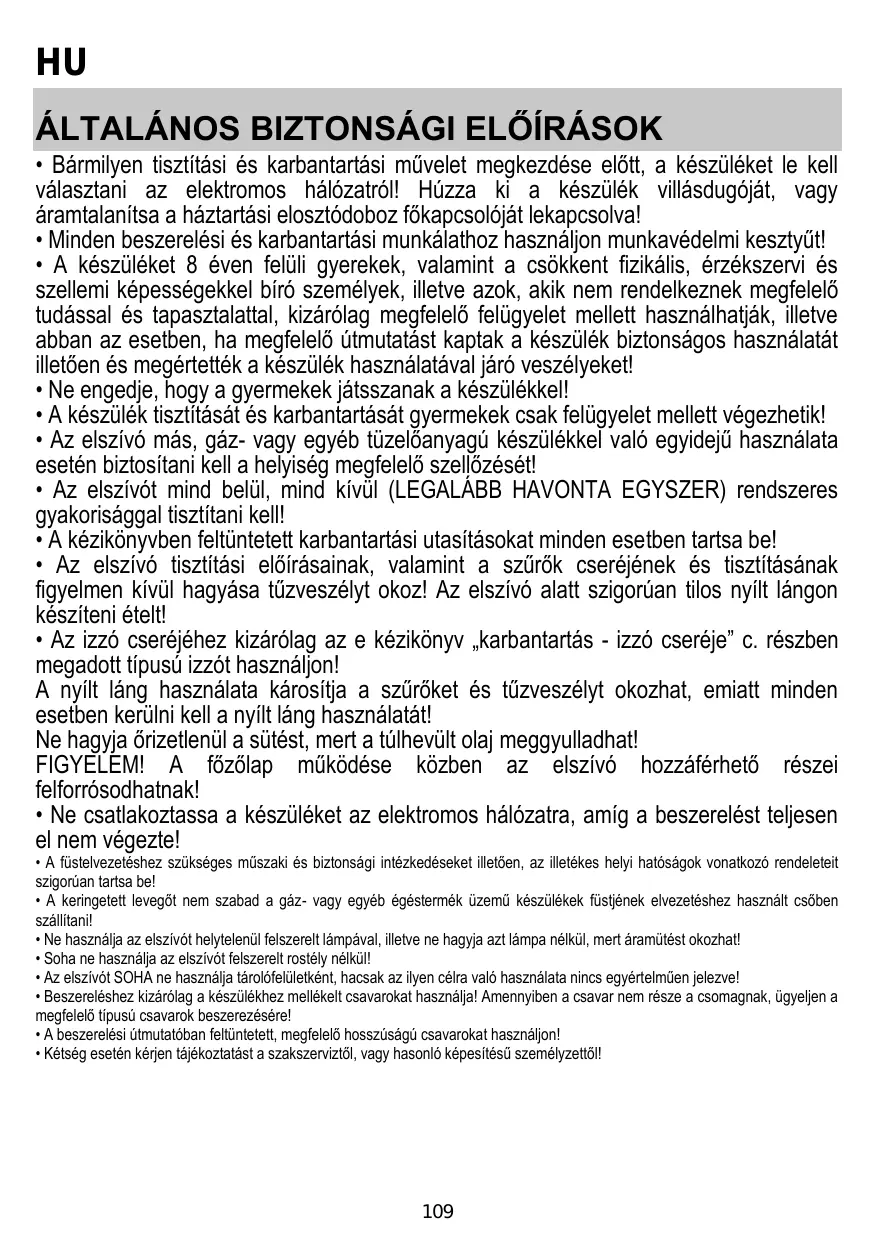 • Les enfants ne doivent pas jouer avec l’appareil. • Le nettoyage et l’entretien par l’usager ne doivent pas être effectués par des enfants sans surveillance. • La pièce doit avoir une aération suffisante lorsque la hotte est utilisée conjointement avec d'autres appareils fonctionnant au gaz ou autres combustibles. • La hotte doit être régulièrement nettoyée à la fois à l'intérieur et à l'extérieur (AU MOINS UNE FOIS PAR MOIS); cela devrait se faire en conformité avec les instructions d'entretien. Le non respect des instructions expressément fournies concernant le nettoyage de la hotte et des filtres peut provoquer des risques d'incendie. • Ne pas flamber d’aliments sous la hotte. • Pour le remplacement de la lampe, utilisez uniquement le type de lampe spécifié dans la section remplacement/maintenance lampe dans ce manuel. L'utilisation d'une flamme nue est dommageable pour les filtres et peut causer un incendie, par conséquent, il est déconseillé de l'utiliser. La friture doit être faite avec soin afin de s’assurer que l’huile surchauffée ne prenne pas feu. AVERTISSEMENT: Lorsque la table de cuisson est en fonctionnement, les parties accessibles de la hotte peuvent devenir très chaudes. • Ne pas brancher l'appareil au réseau électrique avant que l'installation ne soit complètement terminée. • En ce qui concerne les mesures techniques et de sécurité à prendre pour l'évacuation des fumées, respectez strictement les dispositions des règlements locales. • L’air ne doit pas être envoyé dans un conduit utilisé pour évacuer les fumées d’appareils utilisant du gaz ou un autre combustible. • Ne pas utiliser ou laisser la hotte sans les lampes correctement montées, car un éventuel risque de choc électrique est possible. • N’utilisez jamais la hotte sans la grille montée correctement! • La hotte ne doit JAMAIS être utilisée comme une surface d'appui, sauf indication expresse. • Utilisez uniquement les vis de fixation fournies avec le produit pour l'installation, ou, si non fournies, acheter le type correct de vis. • Utilisez la longueur correcte pour les vis qui sont identifiées dans le Guide d'installation. • En cas de doute, consultez votre centre de service agréé ou du personnel qualifié.