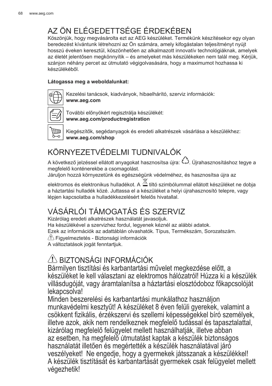 Köszönjuk, hovy megvásárolta ezt az AEG készüléket. Termékünk késztítekor egy oyan beredezeşst kivistantk létrehozni az On számára, amely kifogástalan teljesítémnyt nyújt hosszú éveken keresztül, kószönhetően az alkalmazott innovativ technologiáknak, amelyek az életét jelentösen megkönnytík – és amelyeket más készülékeken nem talál meg. Kérjuk, szánjon néhány percet az utmutató vegigolvasására, hovy a maximumot hazhassa ki készüléköból.