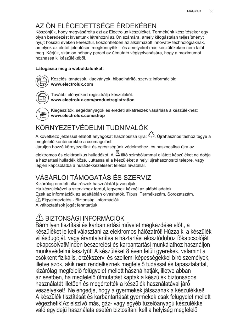 AZ ÖN ELÉGEDETTSÉGE ÉRDEKÉBEN Köszönjük, hogy megvásárolta ezt az Electrolux készüléket. Termékünk készítésekor egy olyan beredezést kívántunk létrehozni az Ön számára, amely kifogástalan teljesítményt nyújt hosszú éveken keresztül, köszönhetően az alkalmazott innovatív technológiáknak, amelyek az életét jelentősen megkönnyítik – és amelyeket más készülékeken nem talál meg. Kérjük, szánjon néhány percet az útmutató végigolvasására, hogy a maximumot hozhassa ki készülékéből. Látogassa meg a weboldalunkat: Kezelési tanácsok, kiadványok, hibaelhárító, szerviz információk: www.electrolux.com További előnyökért regisztrálja készülékét: www.electrolux.com/productregistration Kiegészítők, segédanyagok és eredeti alkatrészek vásárlása a készülékhez: www.electrolux.com/shop