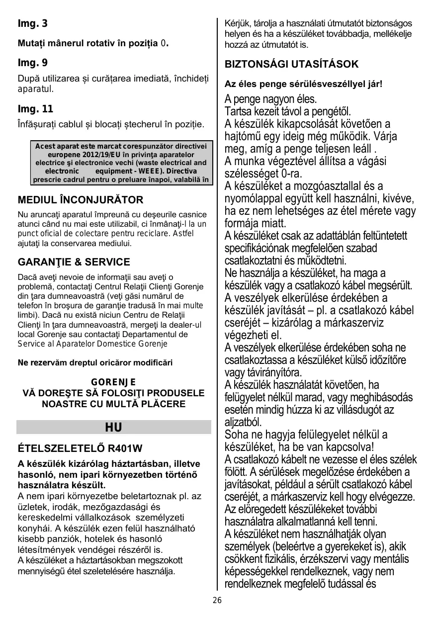 GORENJE VĂ DOREŞTE SĂ FOLOSIŢI PRODUSELE NOASTRE CU MULTĂ PLĂCERE HU ÉTELSZELETELŐ R401W A készülék kizárólag háztartásban, illetve hasonló, nem ipari környezetben történő használatra készült. A nem ipari környezetbe beletartoznak pl. az üzletek, irodák, mezőgazdasági és kereskedelmi vállalkozások személyzeti konyhái. A készülék ezen felül használható kisebb panziók, hotelek és hasonló létesítmények vendégei részéről is. A készüléket a háztartásokban megszokott mennyiségű étel szeletelésére használja. 26