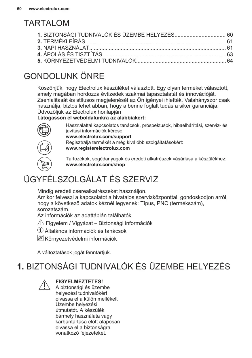 GONDOLUNK ÖNRE Köszönjük, hogy Electrolux készüléket választott. Egy olyan terméket választott, amely magában hordozza évtizedek szakmai tapasztalatát és innovációját. Zsenialitását és stílusos megjelenését az Ön igényei ihlették. Valahányszor csak használja, biztos lehet abban, hogy a benne foglalt tudás a siker garanciája. Üdvözöljük az Electrolux honlapján