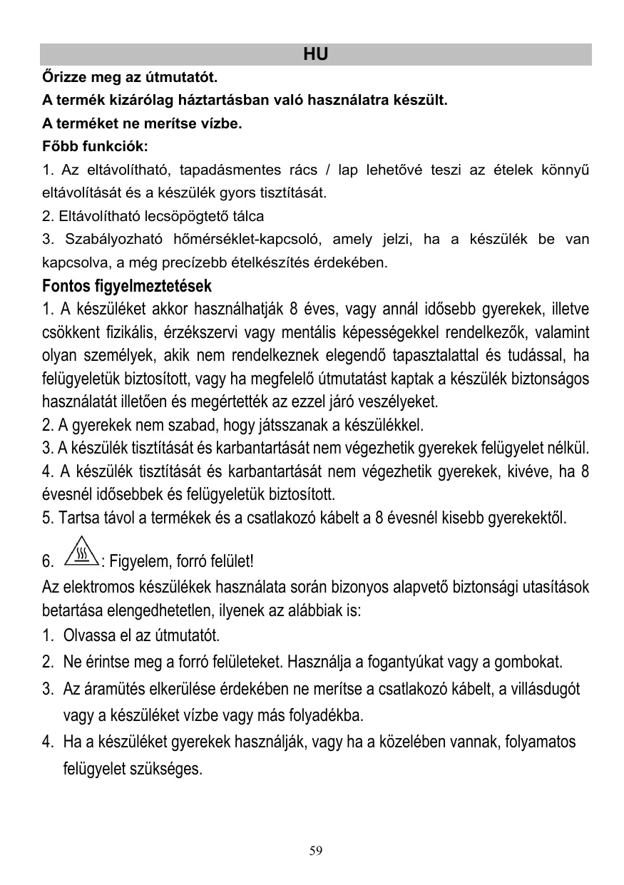 1. Les enfants de 8 ans et plus et les personnes présentant des capacités physiques, sensorielles ou mentales réduites, ou manquant d’expérience et de connaissances, peuvent utiliser cet appareil sous surveillance, à condition d’avoir reçu des instructions sur la manière de s’en servir en toute sécurité et d’avoir compris les risques auxquels ils s’exposent. 2. Les enfants ne doivent pas jouer avec l’appareil. 3. Les enfants ne doivent pas non plus procéder sans surveillance à son nettoyage et à son entretien. 4. Le nettoyage et l’entretien par l'utilisateur ne doivent pas être effectués par des enfants, sauf s’ils ont plus de 8 ans et s’ils sont encadrés. 5. Maintenez le produit et son câble hors de portée des enfants de moins de 8 ans. 6. : Attention, surface chaude Lors de l’utilisation d’appareils électriques, les précautions de base suivantes doivent toujours être respectées, y compris les suivantes : Lisez toutes les instructions. Ne touchez aucune surface chaude. Utilisez les poignées ou les boutons. Pour vous protéger contre les chocs électriques, n’immergez pas le câble, les bouchons ou l’appareil dans de l’eau ou un autre liquide. Comme pour tout appareil, une surveillance étroite est nécessaire lorsqu’il est utilisé par des enfants ou près d'eux. 90