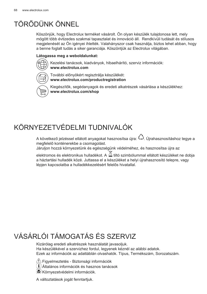 Köszönjük, hogy Electrolux terméket vásárolt. Ön olyan készülék tulajdonosa lett, mely mögött több évtizedes szakmai tapasztalat és innováció áll. Rendkívüli tudását és stílusos megjelenését az Ön igényei ihlették. Valahányszor csak használja, biztos lehet abban, hogy a benne foglalt tudás a siker garanciája. Köszöntjük az Electrolux világában. Látogassa meg a weboldalunkat: Kezelési tanácsok, kiadványok, hibaelhárító, szerviz információk: www.electrolux.com További előnyökért regisztrálja készülékét: www.electrolux.com/productregistration Kiegészítők, segédanyagok és eredeti alkatrészek vásárlása a készülékhez: www.electrolux.com/shop