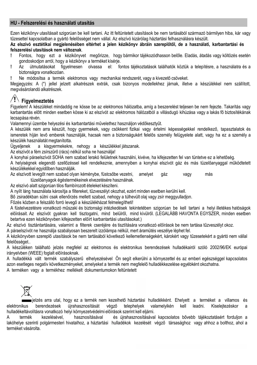 Avant toute opération de nettoyage ou d’entretien, débrancher la hotte du circuit électrique en retirant la prise ou en coupant l’interrupteur général de l’habitation. Munissez-vous de gants de travail avant d’effectuer toute opération d’installation et d’entretien. L’appareil n’est pas destiné à une utilisation par des enfants ou des personnes à capacités physiques, sensorielles ou mentales réduites et sans expérience et connaissance à moins qu’ils ne soient sous la supervision ou formés sur l’utilisation de l’appareil par une personne responsable de leur sécurité. Les enfants doivent être surveillés afin qu’ils ne jouent pas avec l’appareil. Ne jamais utiliser la hotte sans que la grille ne soit montée correctement! La hotte ne doit JAMAIS être utilisée comme plan pour déposer quelque chose sauf si cela est expressément indiqué. Quand la hotte est utilisée en même temps que d’autres appareils à combustion de gaz ou d’autres combustibles, le local doit disposer d’une ventilation suffisante. L’air aspiré ne doit jamais être envoyé dans un conduit utilisé pour l’évacuation des fumées produites par des appareils à combustion de gaz ou d’autres combustibles. Il est formellement interdit de faire flamber les aliments sous la hotte. L’utilisation de flammes libres peut entraîner des dégâts aux filtres et peut donner lieu à des incendies, il faut donc les éviter à tout prix. La friture d’aliments doit être réalisée sous contrôle pour éviter que l’huile surchauffée ne prenne feu. Les pièces accessibles peuvent se réchauffer de façon importante quand elles sont utilisées avec des appareils pour la cuisson. En ce qui concerne les mesures techniques et de sécurité à adopter pour l’évacuation des fumées, s’en tenir strictement à ce qui est prévu dans les règlements des autorités locales compétentes. La hotte doit être régulièrement nettoyée, aussi bien à l’intérieur qu’à l’extérieur (AU MOINS UNE FOIS PAR MOIS, respecter néanmoins les instructions relatives à l’entretien fournies dans ce manuel). La non observation de ces normes de nettoyage de la hotte et du changement et nettoyage des filtres comporte des risques d’incendie. Ne pas utiliser ou laisser la hotte sans que les ampoules soient correctement placées pour éviter tout risque de choc électrique. La société décline toute responsabilité pour d’éventuels inconvénients, dégâts ou incendies provoqués par l’appareil et dérivés de la non observation des instructions reprises dans ce manuel. Cet appareil porte le symbole du recyclage conformément à la Directive Européenne 2002/96/CE concernant les Déchets d’Équipements Électriques et Électroniques (DEEE ou WEEE). En procédant correctement à la mise au rebut de cet appareil, vous contribuerez à empêcher toute conséquence nuisible pour l’environnement et la santé de l’homme.