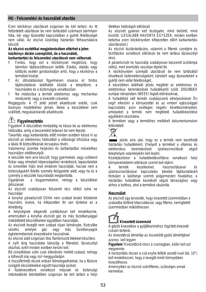 HU - Felszerelési és használati utasítás illetékes hatóságok előírásait. Az elszívót gyakran kell tisztogatni, mind belülről, mind kívülről. (LEGALÁBB HAVONTA EGYSZER, minden esetben betartva ezen kézikönyvben kifejezetten előírt karbantartási utasításokat.) Az elszívó tisztántartására, valamint a filterek cseréjére és tisztítására vonatkozó előírások be nem tartása tűzveszélyt okoz. A páraelszívót ne használja szabályosan beszerelt izzólámpa nélkül, mert áramütés veszélye léphet fel. A kézikönyvben szereplő utasítások be nem tartásából következő kellemetlenségekért, károkért vagy tűzesetekért a gyártó nem vállal felelősséget.. A készüléken található jelzés megfelel az elektromos és elektronikus berendezések hulladékairól szóló 2002/96/EK európai irányelvben (WEEE) foglalt előírásoknak. A hulladékká vált termék szabályszerű elhelyezésével Ön segít elkerülni a környezettel és az emberi egészséggel kapcsolatos azon esetleges negatív következményeket, amelyeket a termék nem megfelelő hulladékkezelése egyébként okozhatna. A terméken vagy a termékhez mellékelt dokumentumokon feltüntetett