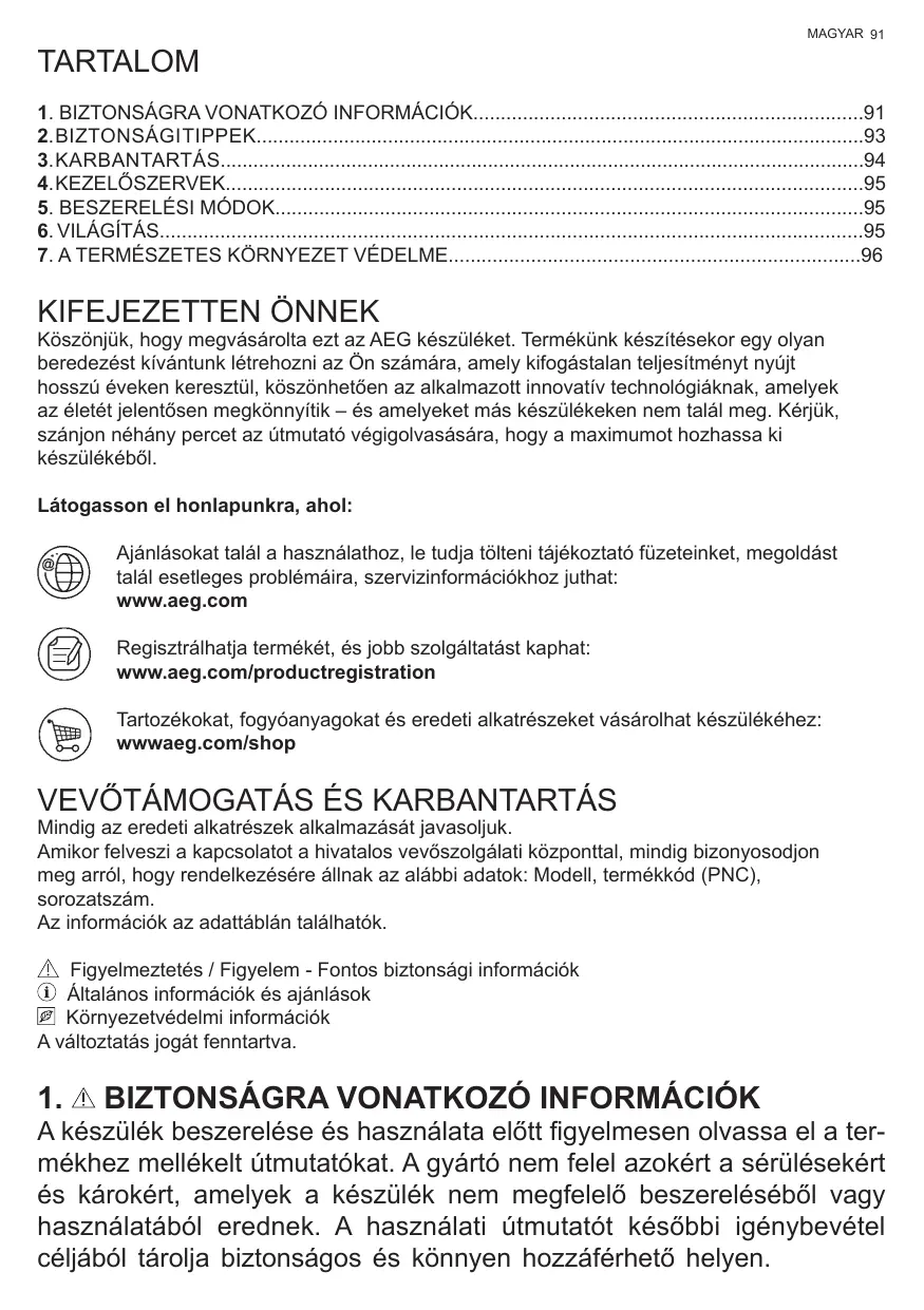 KIFEJEZETTEN ÖNNEK Köszönjük, hogy megvásárolta ezt az AEG készüléket. Termékünk készítésekor egy olyan beredezést kívántunk létrehozni az Ön számára, amely kifogástalan teljesítményt nyújt hosszú éveken keresztül, köszönhetően az alkalmazott innovatív technológiáknak, amelyek az életét jelentősen megkönnyítik – és amelyeket más készülékeken nem talál meg. Kérjük, szánjon néhány percet az útmutató végigolvasására, hogy a maximumot hozhassa ki készülékéből. Látogasson el honlapunkra, ahol: Ajánlásokat talál a használathoz, le tudja tölteni tájékoztató füzeteinket, megoldást talál esetleges problémáira, szervizinformációkhoz juthat: www.aeg.com Regisztrálhatja termékét, és jobb szolgáltatást kaphat: www.aeg.com/productregistration Tartozékokat, fogyóanyagokat és eredeti alkatrészeket vásárolhat készülékéhez: wwwaeg.com/shop