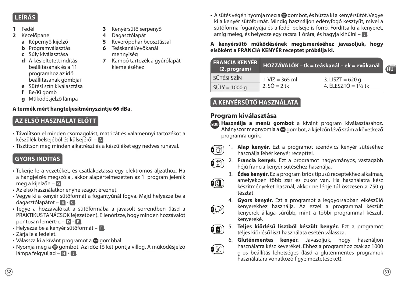 GYORS INDÍTÁS • Tekerje le a vezetéket, és csatlakoztassa egy elektromos aljzathoz. Ha a hangjelzés megszólal, akkor alapértelmezetten az 1. program jelenik meg a kijelzőn – G . • Az első használatkor enyhe szagot érezhet. • Vegye ki a kenyér sütőformát a fogantyúnál fogva. Majd helyezze be a dagasztólapátot – B - C . • Tegye a hozzávalókat a sütőformába a javasolt sorrendben (lásd a PRAKTIKUS TANÁCSOK fejezetben). Ellenőrizze, hogy minden hozzávalót pontosan lemért-e – D - E . • Helyezze be a kenyér sütőformát – F . • Zárja le a fedelet. • Válassza ki a kívánt programot a gombbal. • Nyomja meg a gombot. Az időzítő két pontja villog. A működésjelző lámpa felgyullad – H - I . 52