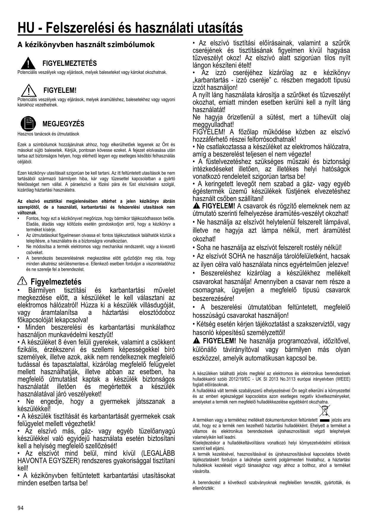 • Az elszívó tisztítási előírásainak, valamint a szűrők cseréjének és tisztításának figyelmen kívül hagyása tűzveszélyt okoz! Az elszívó alatt szigorúan tilos nyílt lángon készíteni ételt! • Az izzó cseréjéhez kizárólag az e kézikönyv „karbantartás - izzó cseréje” c. részben megadott típusú izzót használjon! A nyílt láng használata károsítja a szűrőket és tűzveszélyt okozhat, emiatt minden esetben kerülni kell a nyílt láng használatát! Ne hagyja őrizetlenül a sütést, mert a túlhevült olaj meggyulladhat! FIGYELEM! A főzőlap működése közben az elszívó hozzáférhető részei felforrósodhatnak! • Ne csatlakoztassa a készüléket az elektromos hálózatra, amíg a beszerelést teljesen el nem végezte! • A füstelvezetéshez szükséges műszaki és biztonsági intézkedéseket illetően, az illetékes helyi hatóságok vonatkozó rendeleteit szigorúan tartsa be! • A keringetett levegőt nem szabad a gáz- vagy egyéb égéstermék üzemű készülékek füstjének elvezetéshez használt csőben szállítani! FIGYELEM! A csavarok és rögzítő elemeknek nem az útmutató szerinti felhelyezése áramütés-veszélyt okozhat! • Ne használja az elszívót helytelenül felszerelt lámpával, illetve ne hagyja azt lámpa nélkül, mert áramütést okozhat! • Soha ne használja az elszívót felszerelt rostély nélkül! • Az elszívót SOHA ne használja tárolófelületként, hacsak az ilyen célra való használata nincs egyértelműen jelezve! • Beszereléshez kizárólag a készülékhez mellékelt csavarokat használja! Amennyiben a csavar nem része a csomagnak, ügyeljen a megfelelő típusú csavarok beszerezésére! • A beszerelési útmutatóban feltüntetett, megfelelő hosszúságú csavarokat használjon! • Kétség esetén kérjen tájékoztatást a szakszerviztől, vagy hasonló képesítésű személyzettől! FIGYELEM! Ne használja programozóval, időzítővel, különálló távirányítóval vagy bármilyen más olyan eszközzel, amelyik automatikusan kapcsol be. A készüléken található jelzés megfelel az elektromos és elektronikus berendezések hulladékairól szóló 2012/19/EC - UK SI 2013 No.3113 európai irányelvben (WEEE) foglalt előírásoknak. A hulladékká vált termék szabályszerű elhelyezésével Ön segít elkerülni a környezettel és az emberi egészséggel kapcsolatos azon esetleges negatív következményeket, amelyeket a termék nem megfelelő hulladékkezelése egyébként okozhatna.